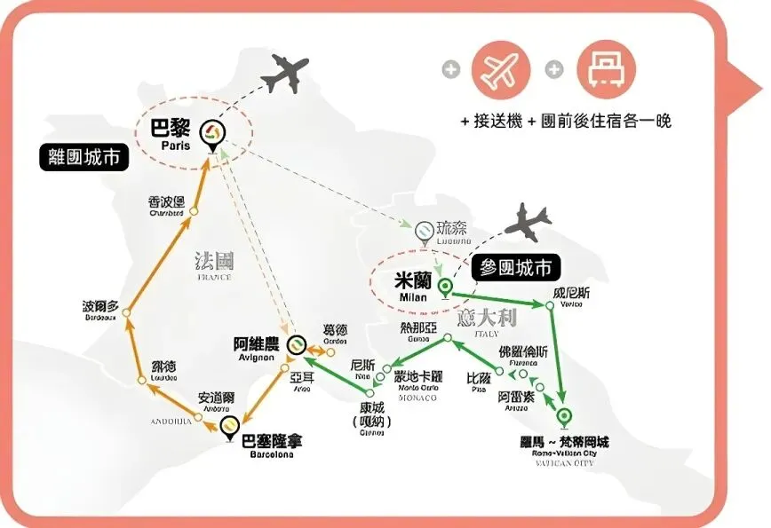 到达和离开的城市不同,想组合多条路线?只要你人在“中转城市”,随时都能加入下一条线路!比如绿线(南法意式)从米兰出发一路玩到阿维农,结果意犹未尽,想继续探索南法地区。那你只需在“中转城市”阿维农停留一晚,第二天就可以无缝接上橙线(圣地之旅),继续玩法国的多个城市,最后从巴黎离开欧洲。