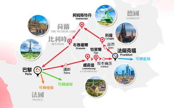 可选择9条线路中任意一条线路,比如红线(西欧经典),从阿姆斯特丹出发,用7天时间畅游法国、比利时、卢森堡、德国等城市,最后再回到阿姆斯特丹。