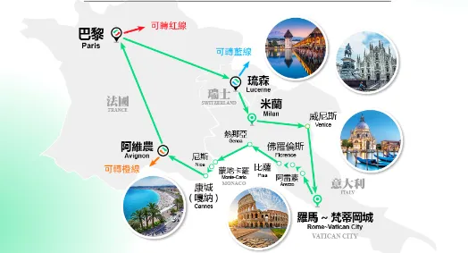绿线:瑞士意大利南法7日之旅