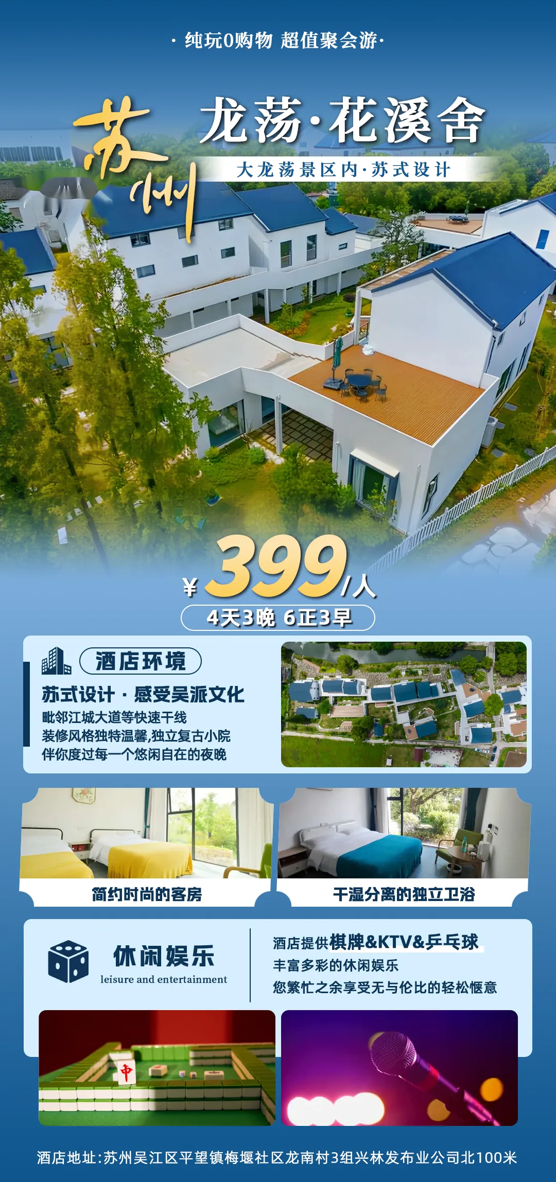 苏州·大龙荡景区内【龙荡·花溪舍】399元每人,4天3晚6正3早!享棋牌&KTV&乒乓球!苏式设计,感受吴派文化!
