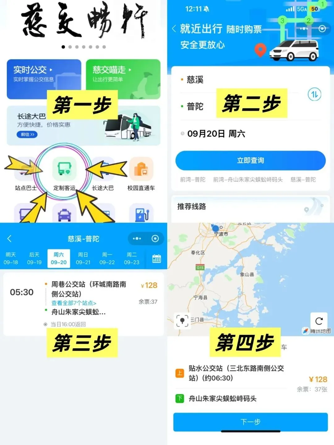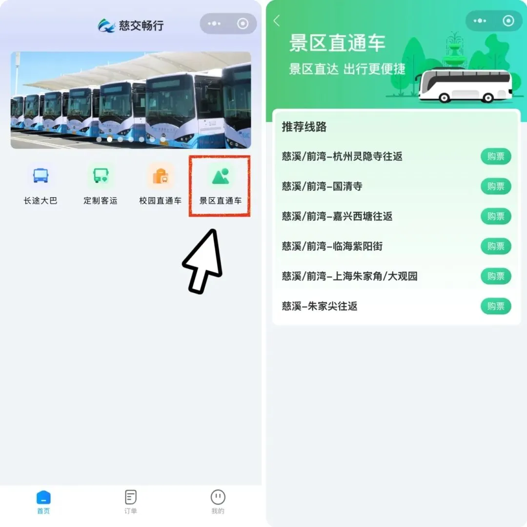 慈交景区直通车,通过“慈溪公运”小程序,进入“景区直通车”板块,选择日期和线路进行购票。