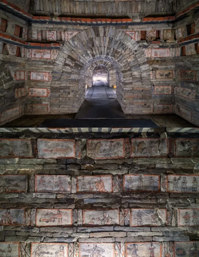 砖画是亮点,车马出行、庖厨酿酒、围猎宴饮,一砖一格像漫画。