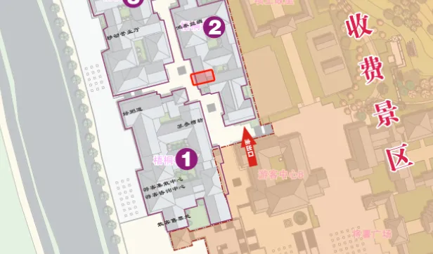 商铺位置:2号楼南侧二层-景区出口(图中标红区域)