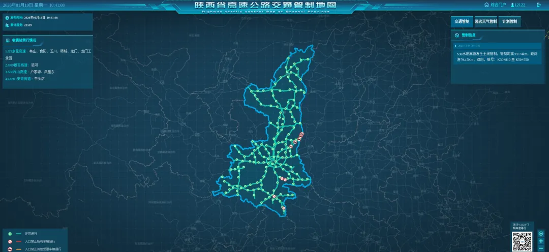 1.因施工,2025年10月31日至2026年4月28日,丹宁高速水阳段凤凰东至户家塬之间K50+416至K31+307段双向临时管控,山阳至柞水方向车辆由户家塬收费站分流下高速后绕行省道S56190(色杏路)从凤凰东收费站上高速往柞水县,柞水至山阳方向车辆由凤凰东收费站分流下高速后绕行省道S519(色杏路)从户家塬收费站上高速往山阳县。户家塬收费站入口柞水方向临时管控,凤凰东收费站入口山阳方向临时管控,柞水方向禁止危化品车辆通行。