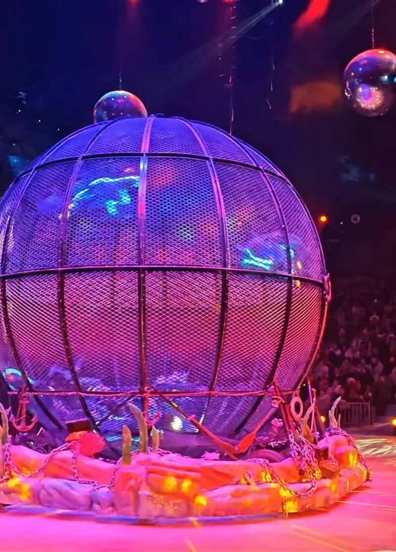 视频画面显示,有4位演职人员在巨型圆球内骑摩托车表演,其中2位演职人员在骑车过程中发生碰撞并摔倒。