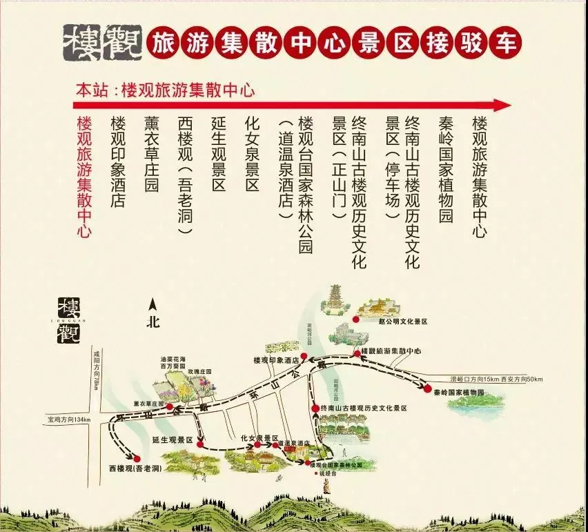 正式运行的楼观直通车将从城北客运站旅游集散中心、城南客运站旅游集散中心及陕西省汽车站出发,直达楼观旅游集散中心,同时以这里为中心开设楼观景区接驳车,向东连通秦岭国家植物园,向西可达楼观薰衣草庄园,期间经过赵公明文化景区、终南山古楼观历史文化景区、楼观印象酒店、楼观道温泉酒店、楼观台国家森林公园、化女泉景区和延生观景区,形成了一个“市区直达,多点触及”的旅游交通闭环,有效缓解了西安至楼观以及楼观区域内的旅游交通压力。