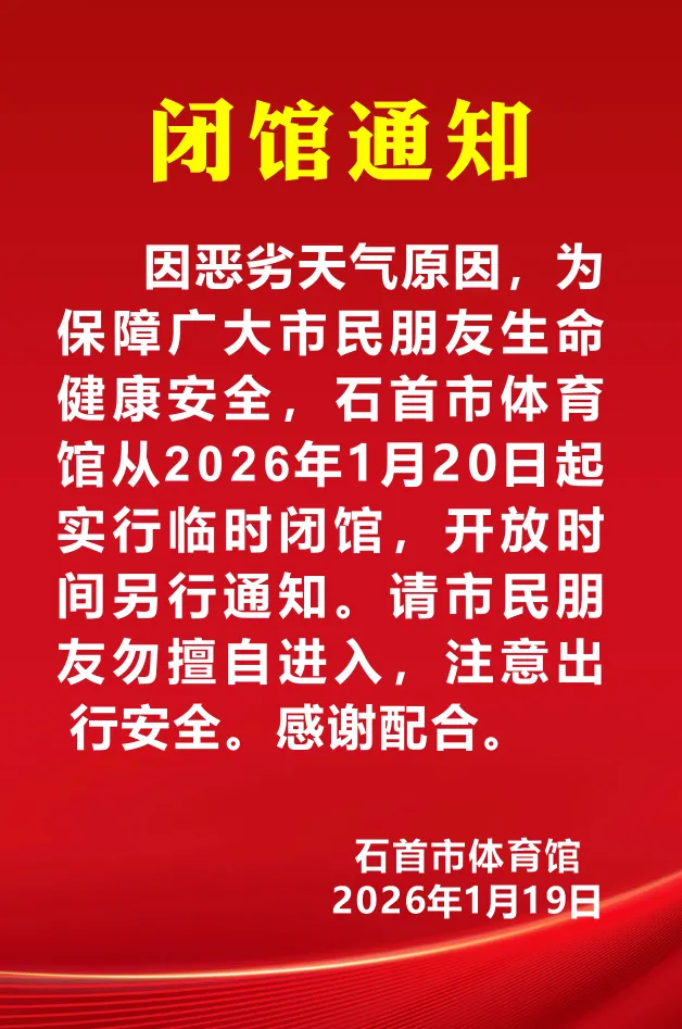 石首部分场馆及景区景点临时封闭通知!一场突如其来的冰雪寒潮席卷荆楚大地,全市相关部门和单位做足了各类安全保障措施,与之同步的是,为了确保市民百姓出行和人身安全,石首部分场馆及景区景点相继发布封闭通知,望扩散转发,提前做好出行规划,确保安全!