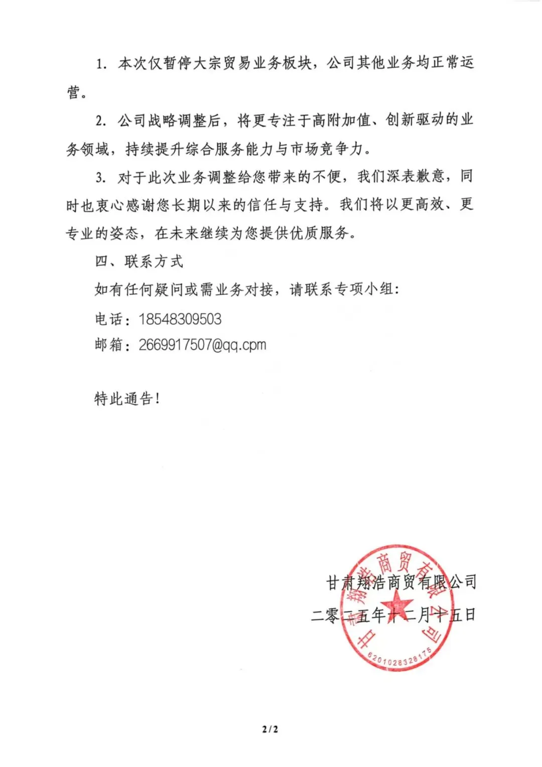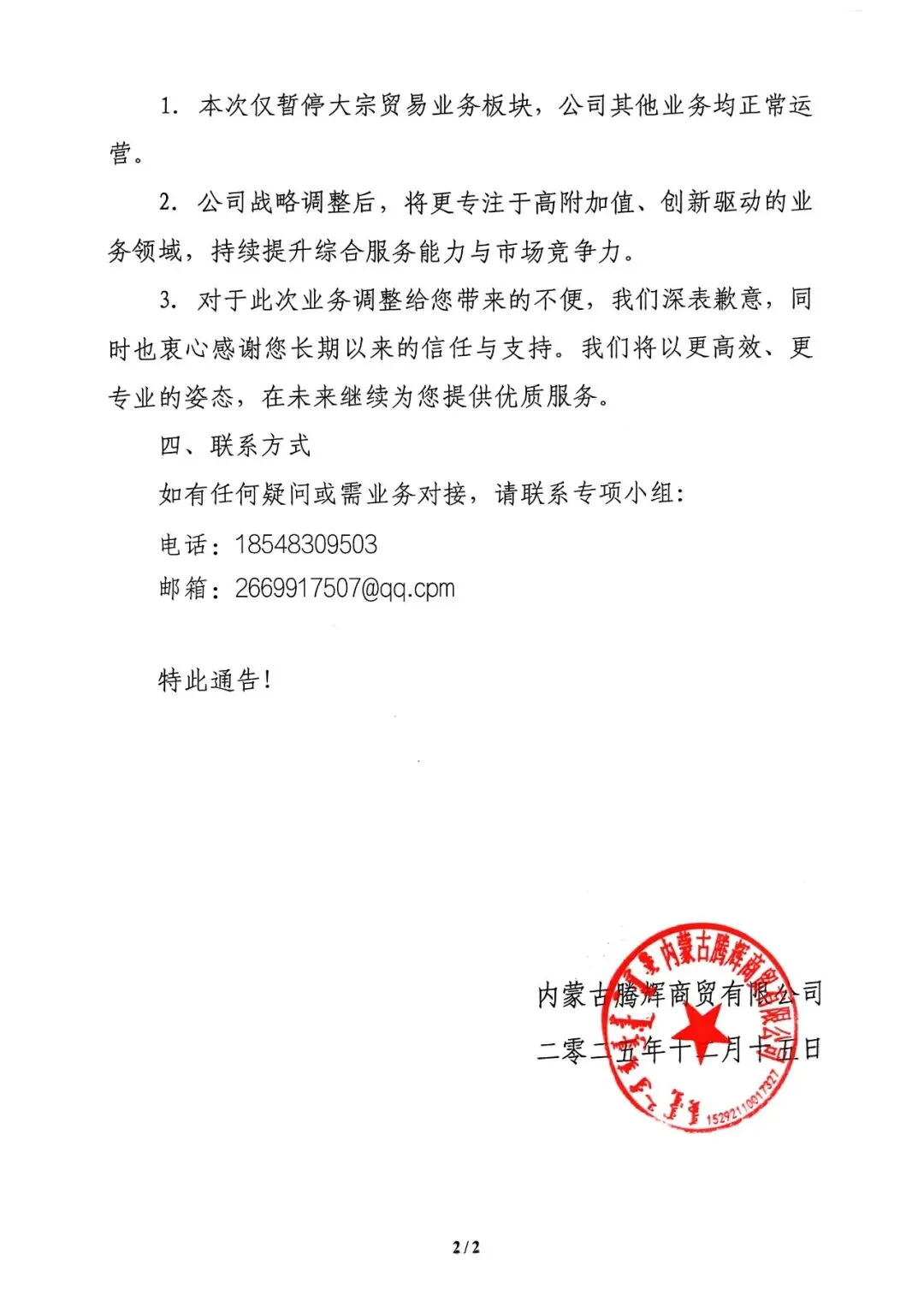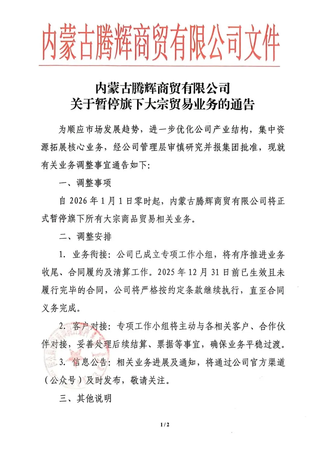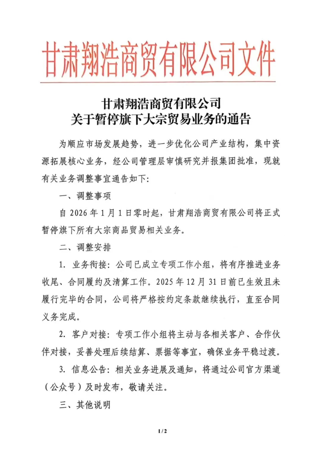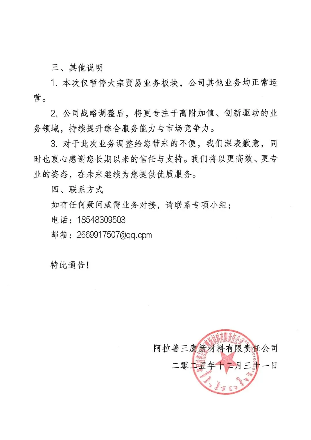 关于阿拉善左旗文化旅游集团有限公司暂停所属企业大宗商品贸易相关业务的通告