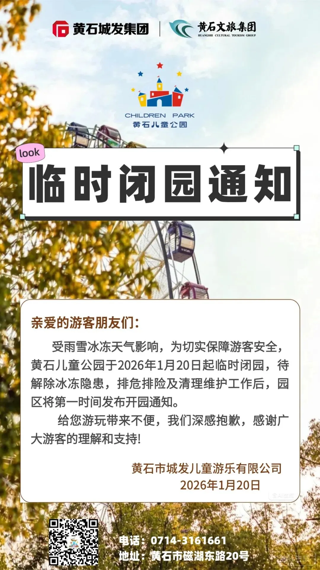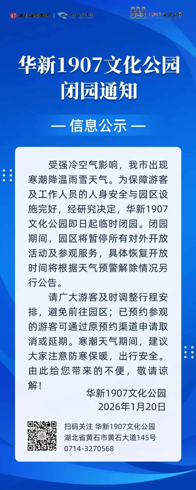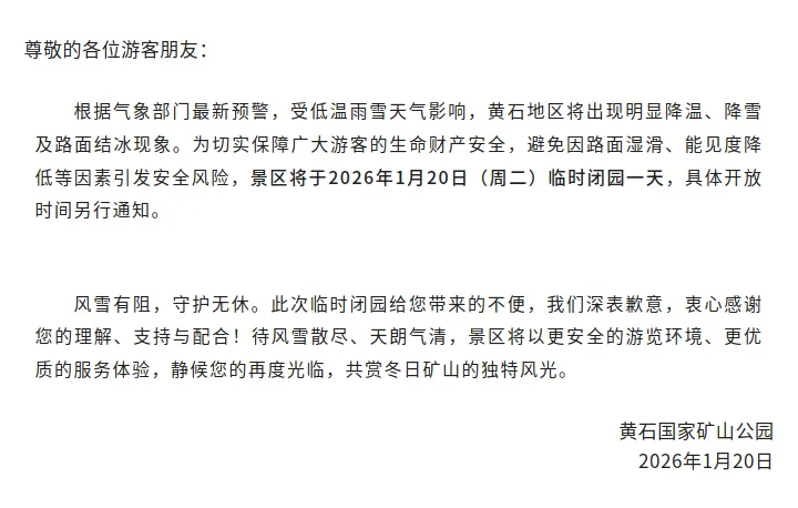 您现在的位置是:首页 > 国内旅游目的推荐 > 正文 国内旅游目的推荐 注意!黄石多家景区临时闭园 admin2026年01月20日 18:05:23国内旅游目的推荐1 注意!黄石多家景区临时闭园受低温雨雪冰冻天气影响为最大限度保障广大游客人身财产安全和游玩体验除了昨天发布闭园的2家景区之外(点击上方文字,查看详情)今天黄石4家景区发布公告宣布临时闭园华新1907文化公园黄石儿童公园西塞山景区黄石国家矿山公园说明:具体恢复开园时间请以各景区公众号最新公告为准。黄石文旅提醒此轮寒潮天气来势汹汹降温幅度大、风力强劲低温持续时间长需及时添衣保暖谨防呼吸系统和心脑血管系统等方面疾病的发生同时降水相态复杂有雨雪及冻雨的转换需提前做好防范措施游黄石,吃三鲜!逛吃黄石,跟着三鲜走就对了!来源:文旅黄石综合编辑:陈芷珊初审:陈麒终审:曹杰 转载请说明来源于"旅荐网",部分内容转载自网络,如有侵权请联系qlwl@foxmail.com删除 本文地址:https://www.15386.cn/post/84218.html 上一篇 【国企】成都文化旅游发展集团有限责任公司下属企业招聘!1月22日截止! 下一篇 最新通知:老君山景区将恢复正常开放! 相关文章 扬州市茱萸湾景区部分房屋招租公告 阳产土楼景点暂停营业公告! 江门新增3家AAA景区! 盐田文旅运营景点2026年婚拍合作服务商招募公告 一键串联核心景点!宣城市区首条旅游专线来了→ 罗田一知名景区临时闭园 贵州旅游全攻略,景点路线、特色美食与实用贴士 深入排查隐患 守护景区平安-成陵公安分局深入景区开展反恐大检查 关于印发2026年版团队旅游合同(示范文本)的通知 四川探索打破无障碍旅游堵点,让更多残障人士抵达“诗与远方” 发表评论 取消回复 评论列表 这篇文章还没有收到评论,赶紧来抢沙发吧~