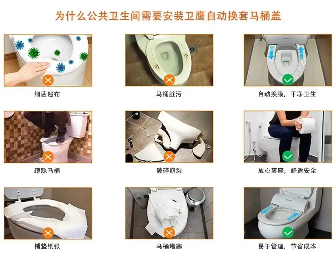 为了保障顾客的卫生安全,建议公共场所运营者及时给公共卫生间安装配套卫生防护设备---卫鹰产品(自动换套马桶盖或商用智能马桶)。