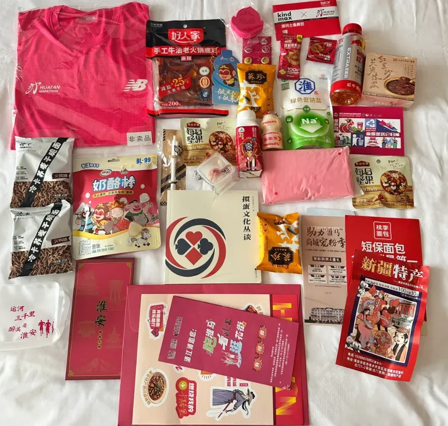 参赛物资:参赛服、奶酪棒、干脆面、火锅底料、号码簿扣、能量胶、坚果、饮料、低钠盐等;
