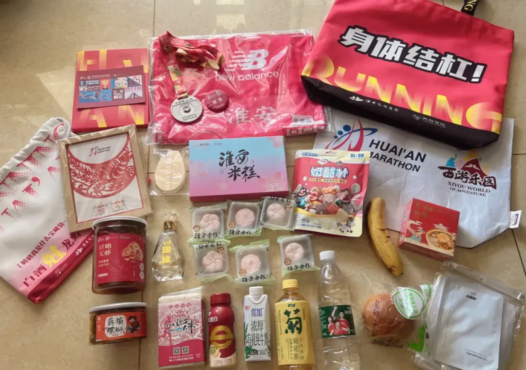 完赛物资:完赛奖牌、完赛包、毛巾、完赛拖鞋、空顶帽(半马选手)、完赛服(全马选手)、盱眙小龙虾、白酒、奶酪棒、米糕、香蕉、水、饮料、蛋白饮、非遗剪纸等;