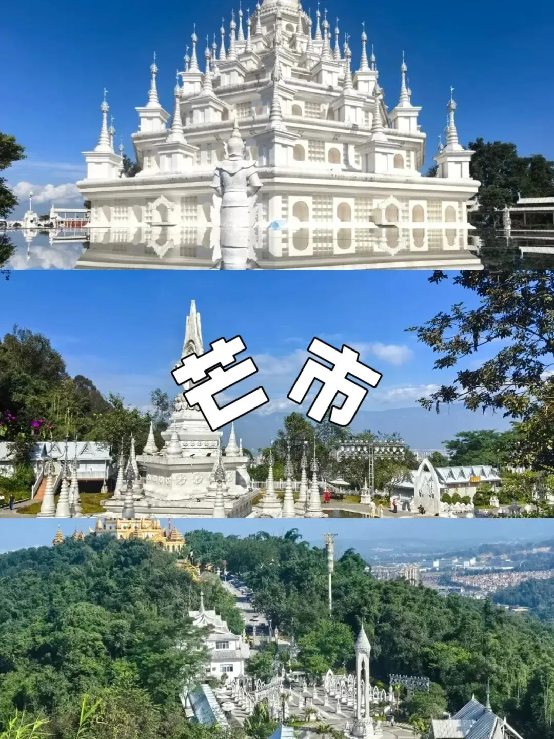 勐焕银塔:通体纯白、风格圣洁,夜晚灯光下如梦似幻,是拍摄 “大片” 的绝佳背景,与大金塔共同构成芒市的标志性天际线。