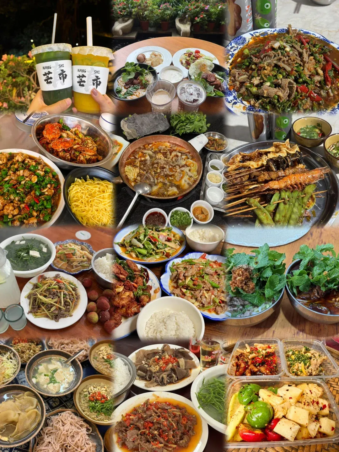 绿叶宴:景颇族特色,所有菜肴用绿叶盛装(如景颇鬼鸡、烤鱼、手抓饭),充满山野气息。