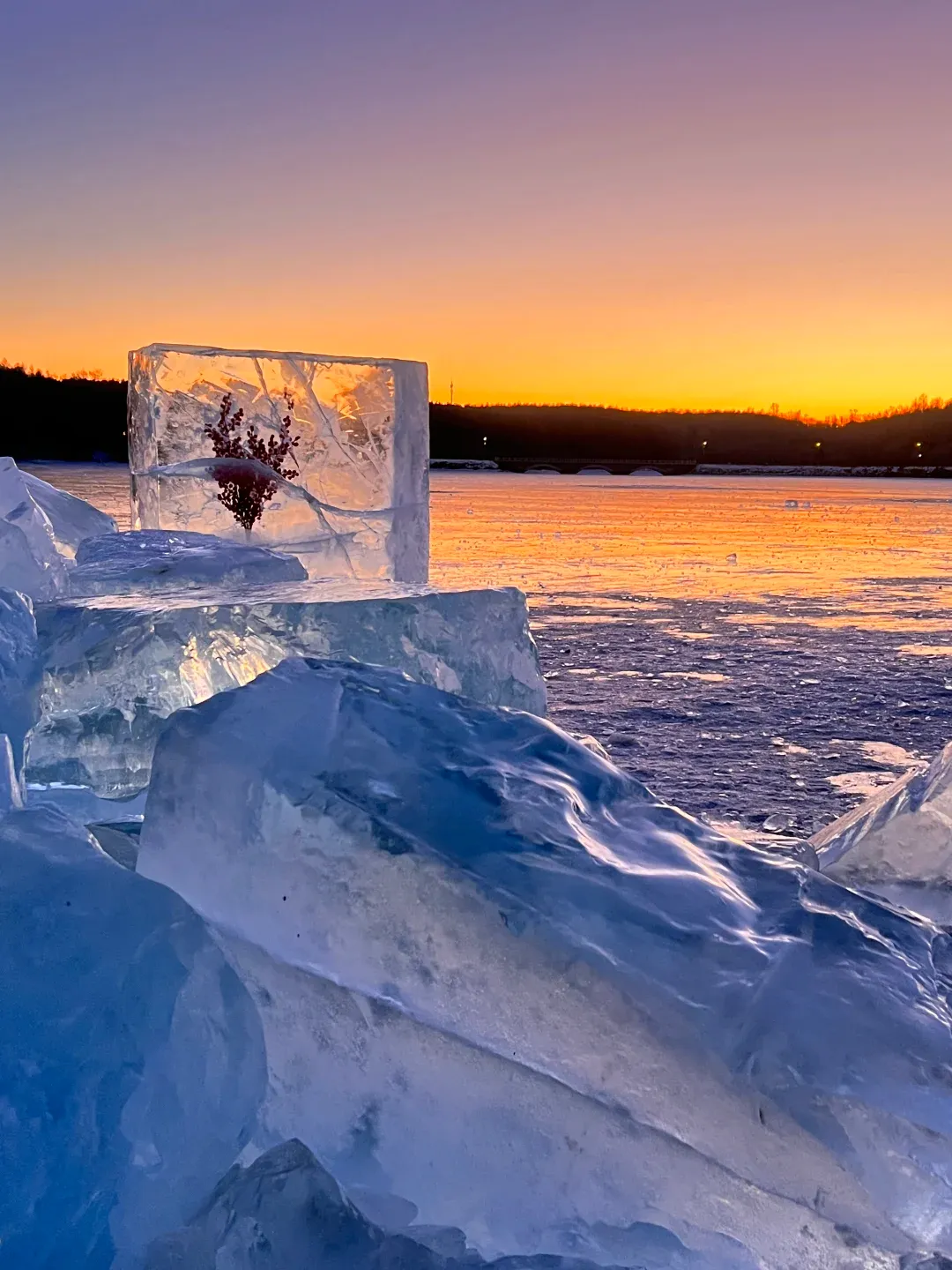 📸 值得定格的一刻:净月潭的蓝冰湖畔,一棵挂满冰霜的孤树倒映在如镜的冰面上,构成一个完美的、对称的冰雪世界,简洁而震撼。