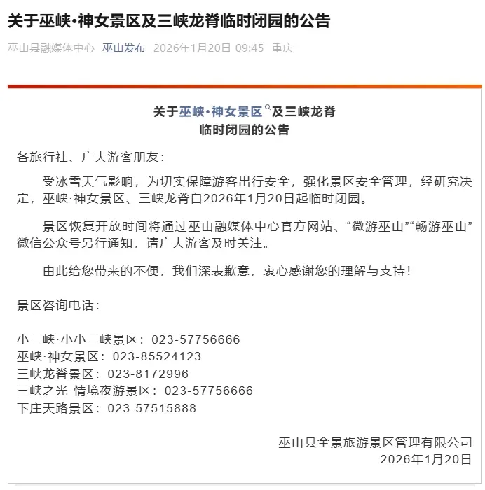 1月20日,巫峡·神女景区及三峡龙脊景区发布公告:受冰雪天气影响,为切实保障游客出行安全,强化景区安全管理,经研究决定,巫峡·神女景区、三峡龙脊自2026年1月20日起临时闭园。景区恢复开放时间将通过巫山融媒体中心官方网站、“微游巫山”“畅游巫山”微信公众号另行通知,请广大游客及时关注。