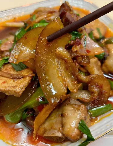 略带辣味,鲜嫩醇香,同样入选天府旅游美食名单。连山回锅肉的肉片大且薄,所谓“锅盔回锅肉”,肉片大得能盖住整个碗口!用的是二刀肉,肥瘦相间,灯盏窝状,裹上甜面酱和豆瓣酱,那滋味,绝了。必须去广汉连山镇吃,路边的苍蝇馆子最正宗,人均50吃到撑。