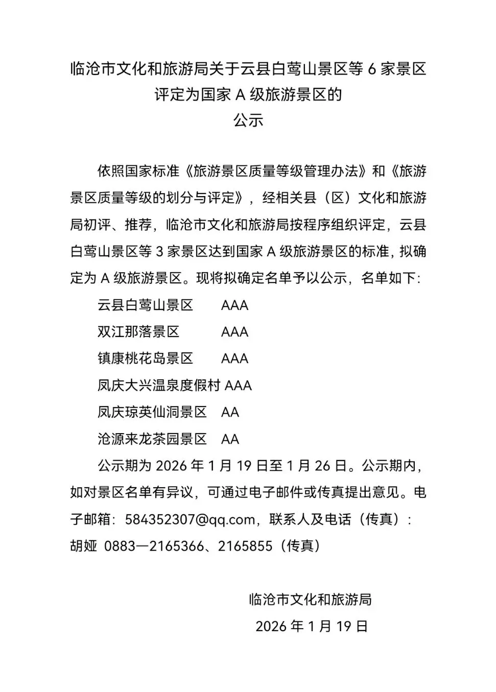 2025年,经相关县(区)文化和旅游局初评与推荐,临沧市文化和旅游局依据国家标准《旅游景区质量等级管理办法》及《旅游景区质量等级的划分与评定》,组织开展了国家A级旅游景区评定工作。经综合评审,共有6家景区达到国家A级旅游景区标准,拟评定为国家A级旅游景区。