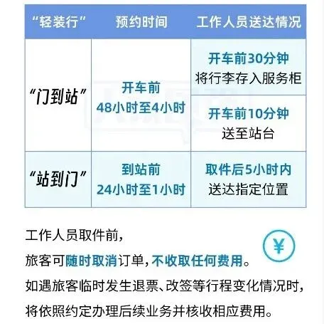 中铁快运“轻装行”服务试点范围自1月15日起扩容至111个车站,将大大减轻旅客携带大件行李负担,让乘坐火车出行更轻松。在新增的92个车站中,位于江苏的南京南站、南京站、苏州站、徐州站、徐州东站、无锡站、常州站7座车站名列其中。抵离上述火车站,无论是“出发地至车站”还是“车站至目的地”,都可以预约“轻装行”服务。