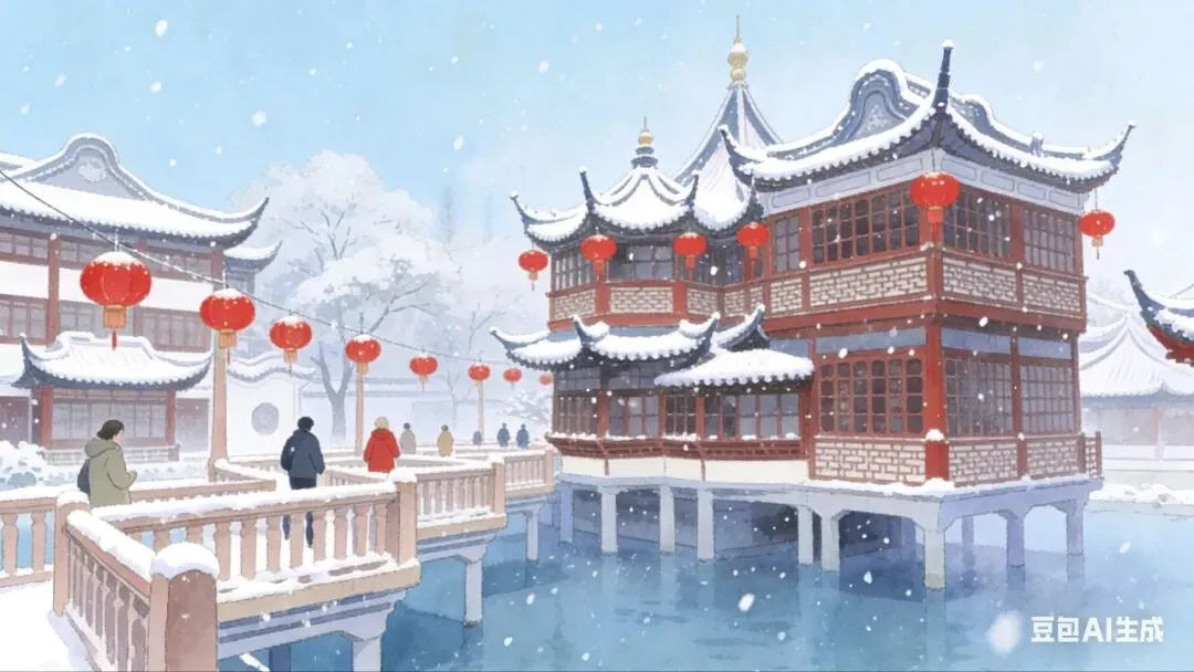 明代园林的飞檐翘角积着薄雪,九曲桥上银装素裹,红灯笼在白雪映衬下年味十足。古银杏的枝桠挂着雪霜,与雕花窗棂相映成趣,仿佛穿越回明清的冬日江南,随手拍都是中式浪漫大片。