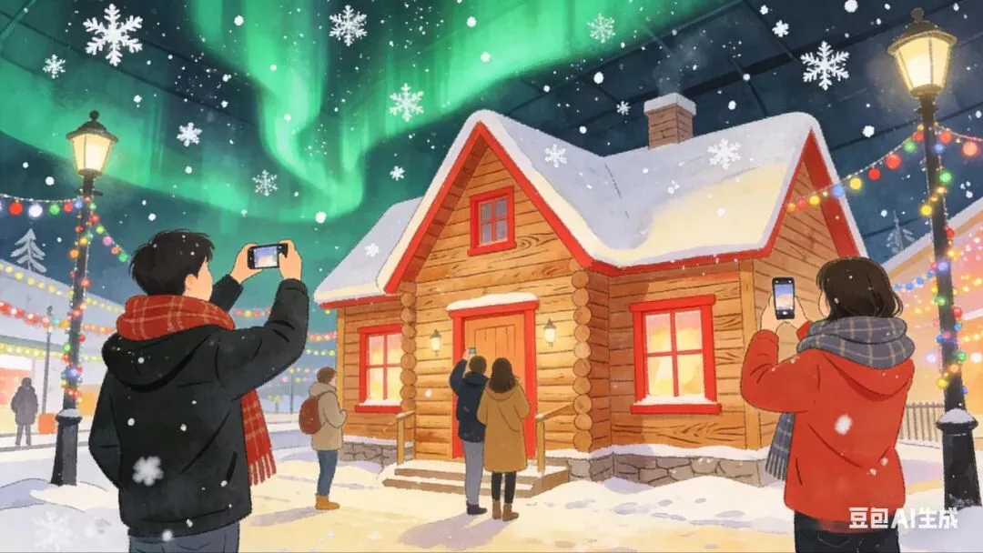 6500平方米全景天幕下,极光与雪花交织,北极熊“泡澡”冰雕萌态十足。19点后定时飘落的“鹅毛大雪”,搭配爵士乐队演出,小木屋与缆车布景,仿佛闯入北欧童话小镇。