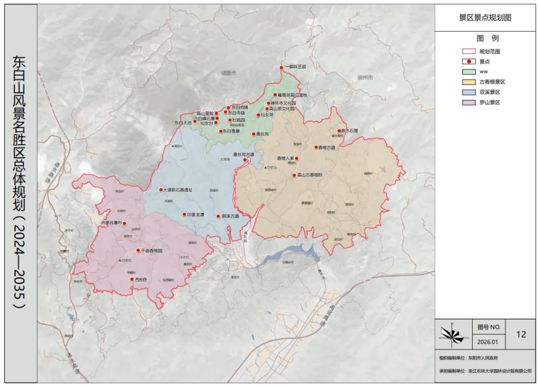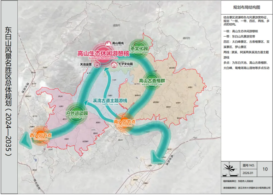 结合景区资源特色与风景游赏特征,东白山风景名胜区拟规划“一核、一带、四区、两线、多点”结构。