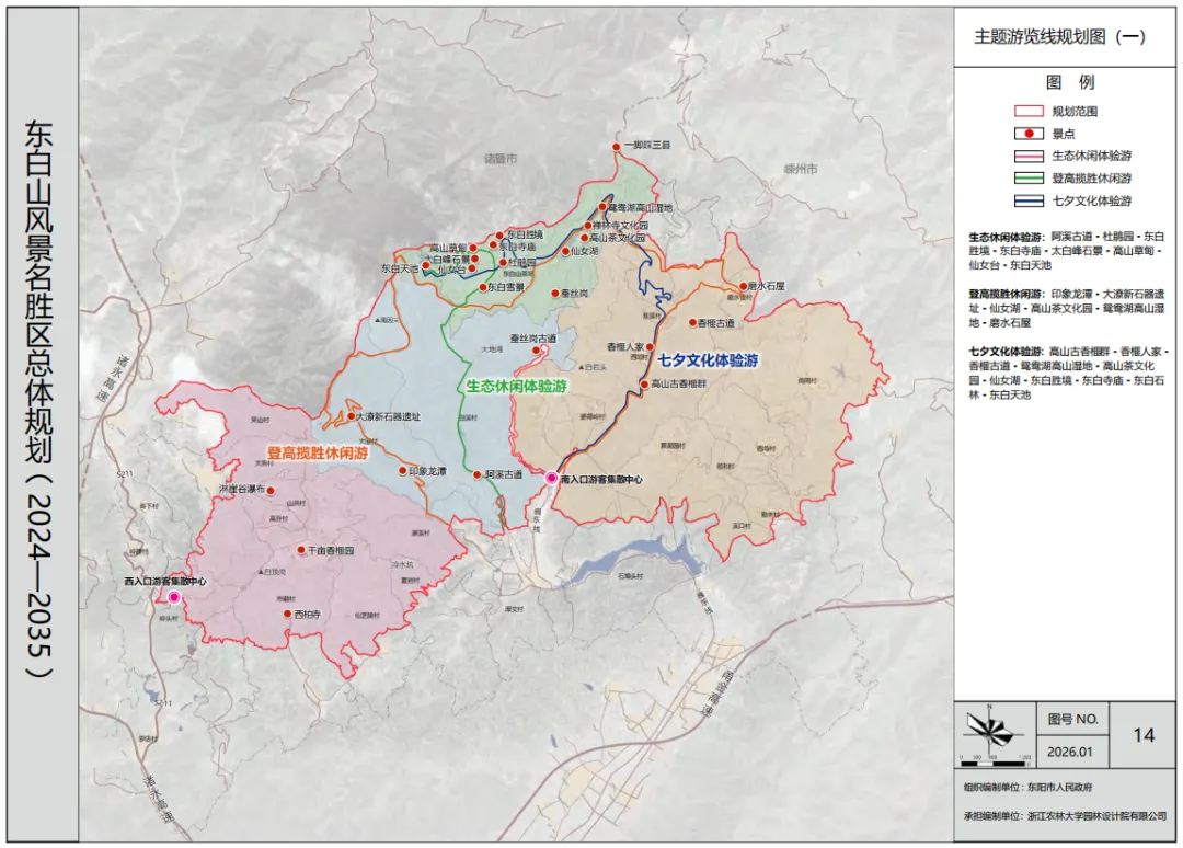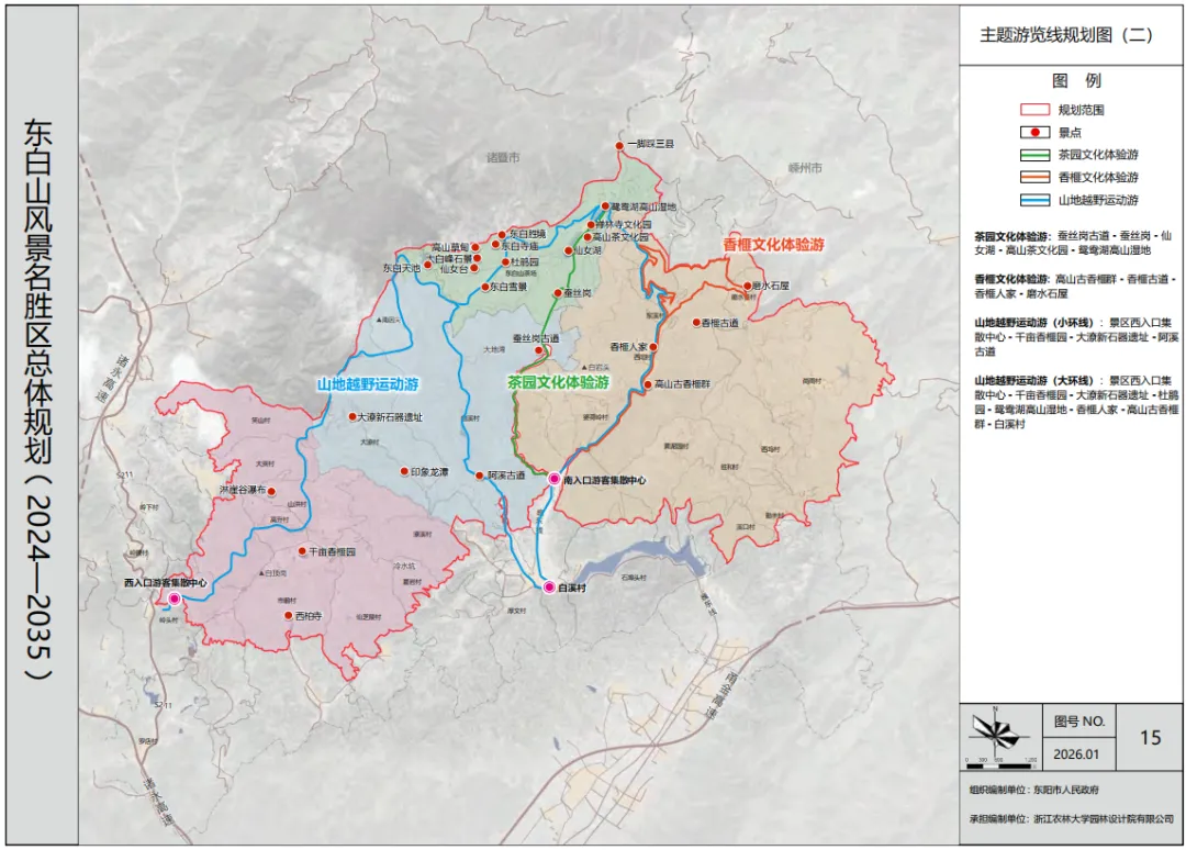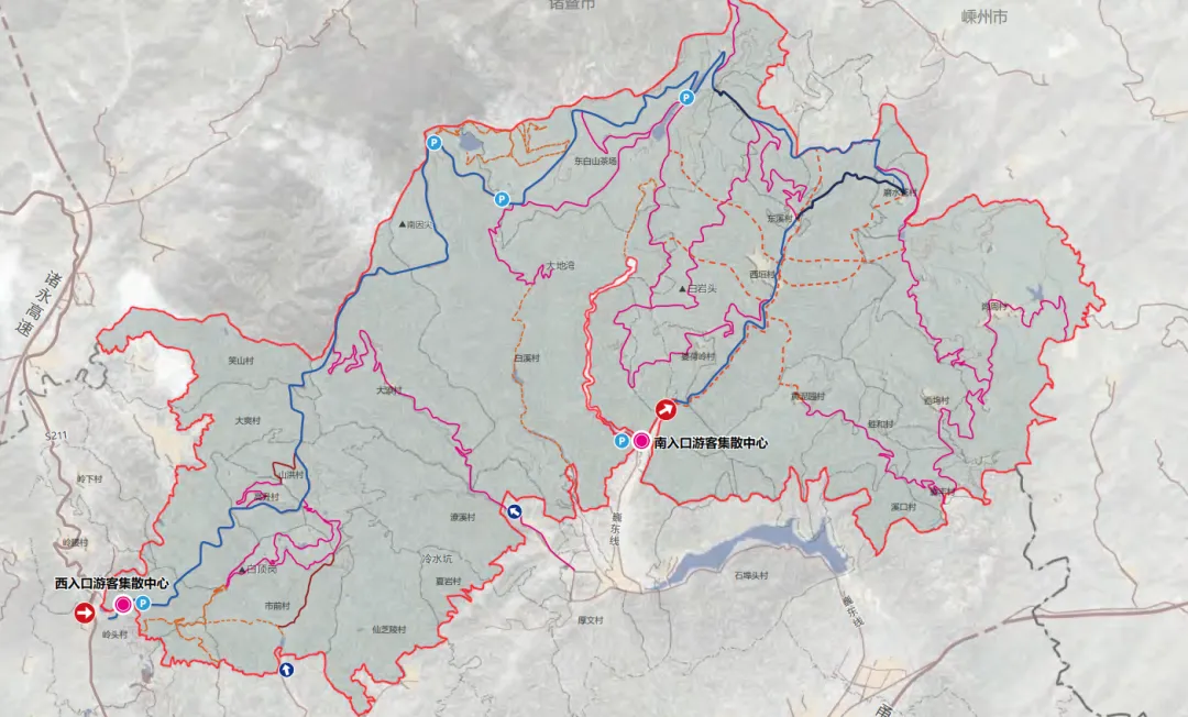 “多节点”:东白天池、高山古香榧群、太白峰、鸳鸯湖高山湿地以及西、南两个入口节点等多点互动。