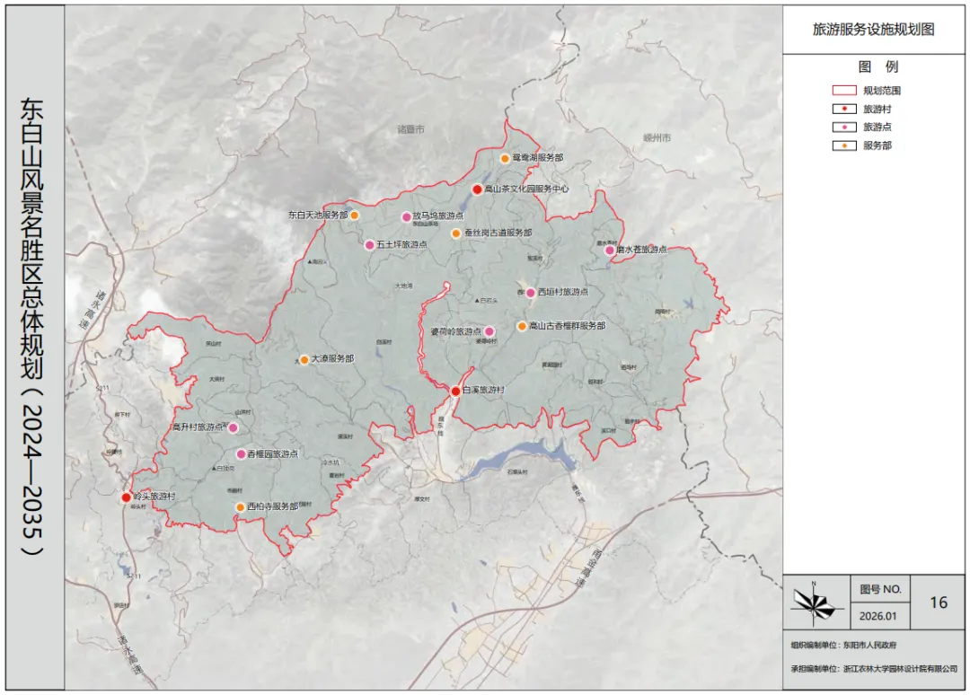 东白山风景名胜区游览服务设施分级与用地分类与性质紧密结合,将游览设施分为服务部、旅游点、旅游村、旅游镇4个规模等级。