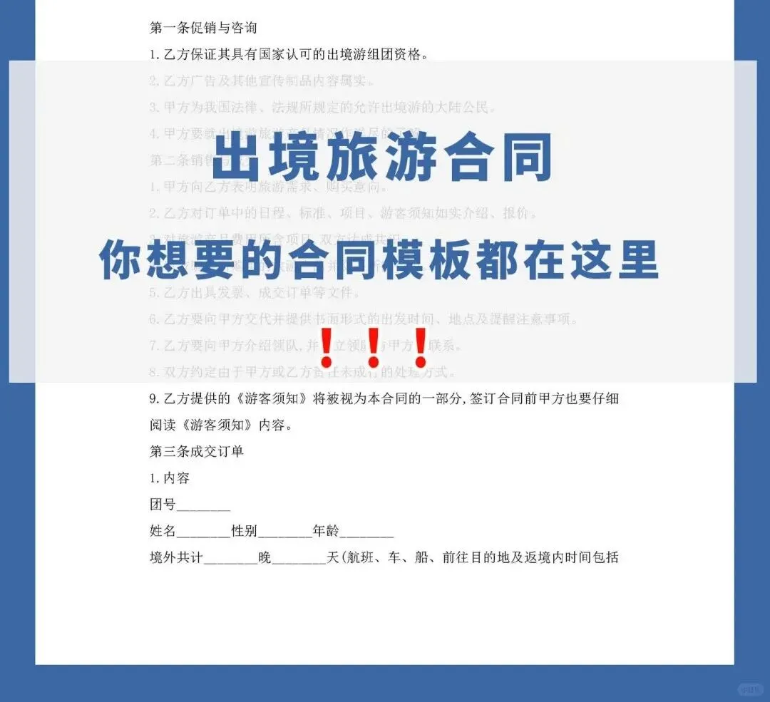 ✈️不管你是选择出发地跟团,当地参团,或者私人定制团,出发前都需要签订合同,这是保障自己,旅游合同通用条款不能修改的,重点看填写的内容,如果不合适可以修改内容的