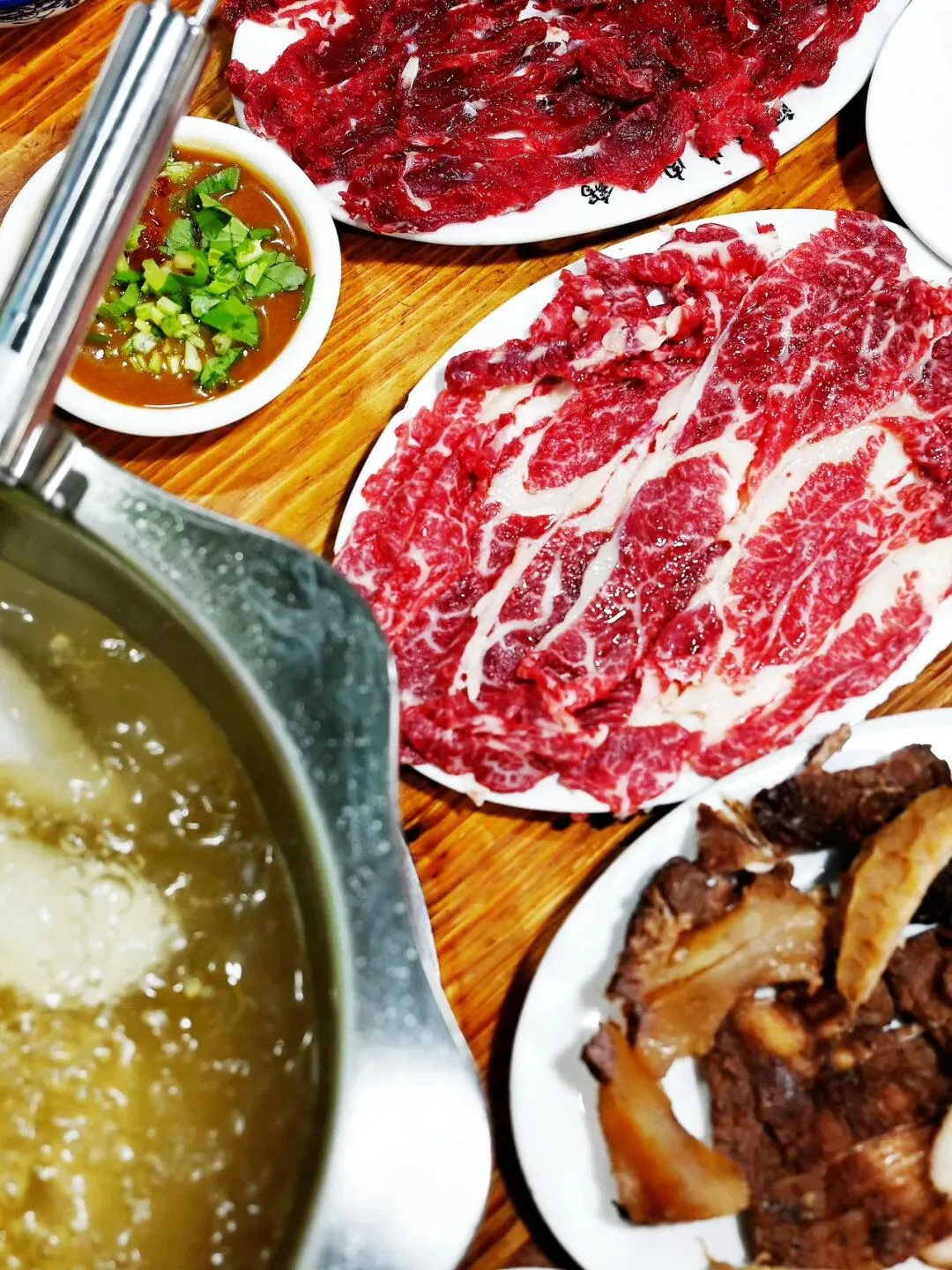 ①牛肉火锅:八合里总店排队300桌?转身去“杏花吴记”,本地司机带路,吊龙匙柄五花趾一次性点齐,牛肉丸比乒乓球还弹,蘸沙茶+黄豆酱,香到跺脚。