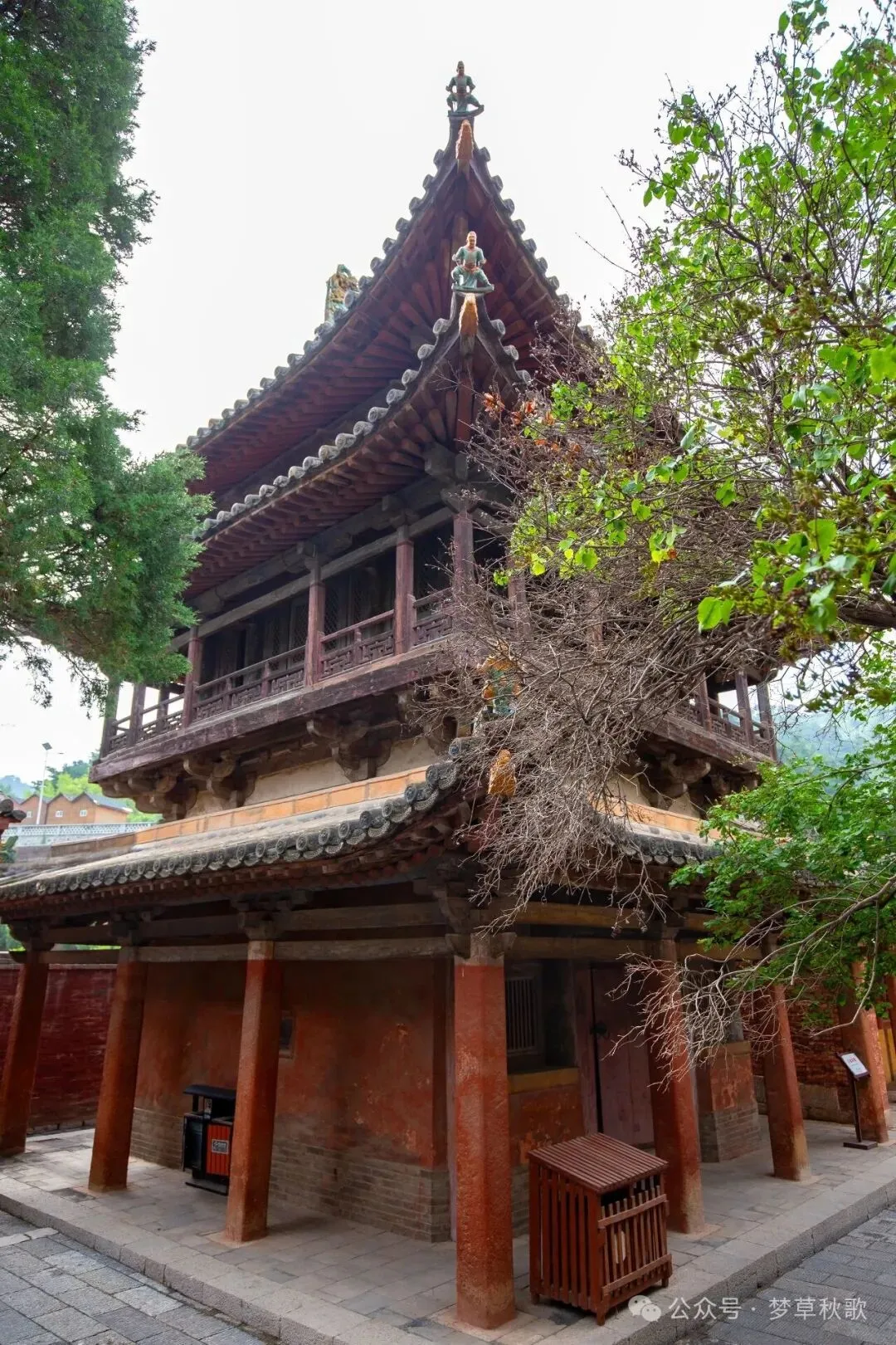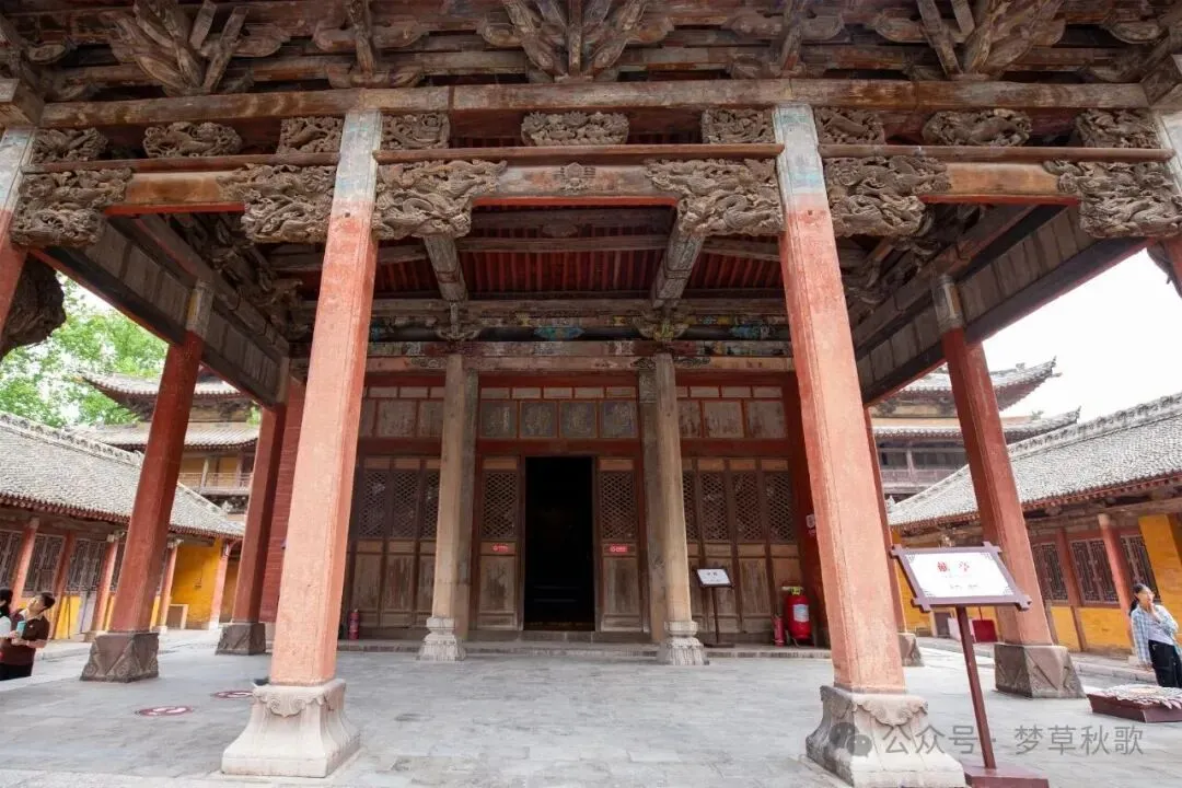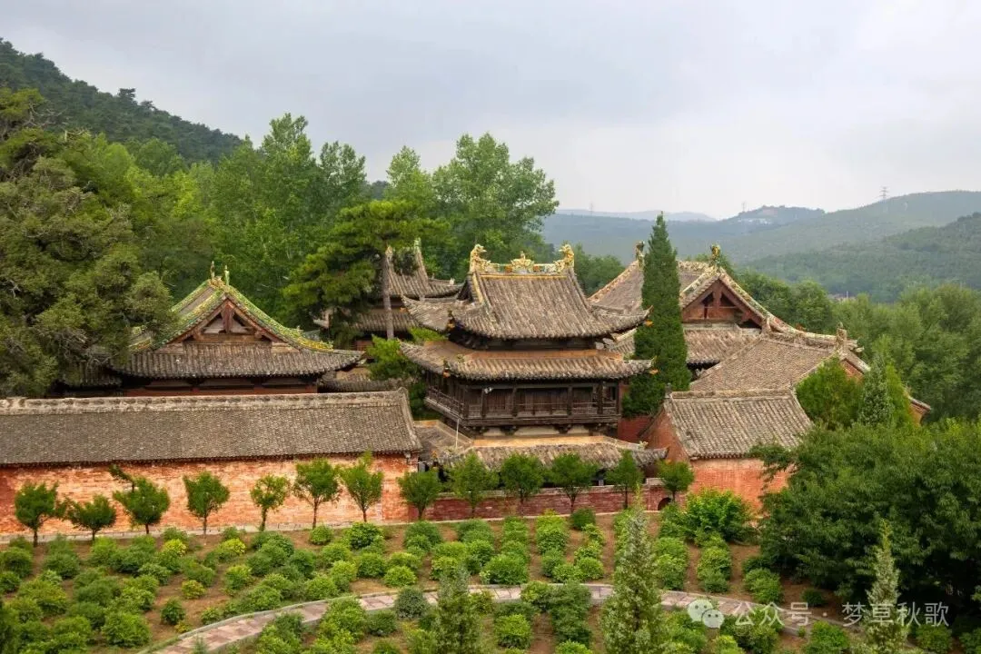 让人意外的是,这座庙居然不用买门票,也不用预约,推开门就能进。一进山门就被眼前的格局惊到了——别的寺庙大多是“背山面水”,这儿偏偏反过来,“背水面山”,北边是哗哗流淌的西溪水,南边对着青翠的栖凤山,山水环绕着整座庙宇,难怪元好问十五岁来这儿时,会写下“青山无恙画屏开”的诗句,这景色确实像一幅活的山水画。山门本身也很有意思,是座清代的二层戏楼,下层能过人,上层是戏台,据说这种设计不管站在院子哪个角落,都能听清戏台上的唱词,古人的“声学智慧”真是让人佩服。