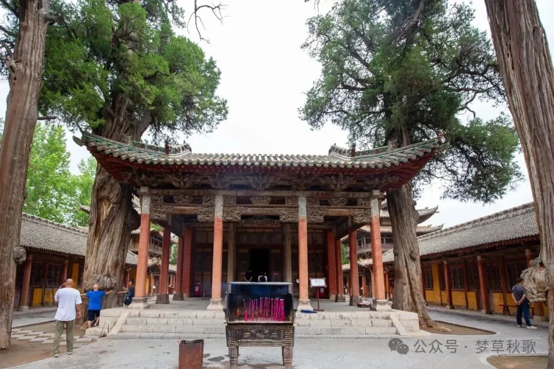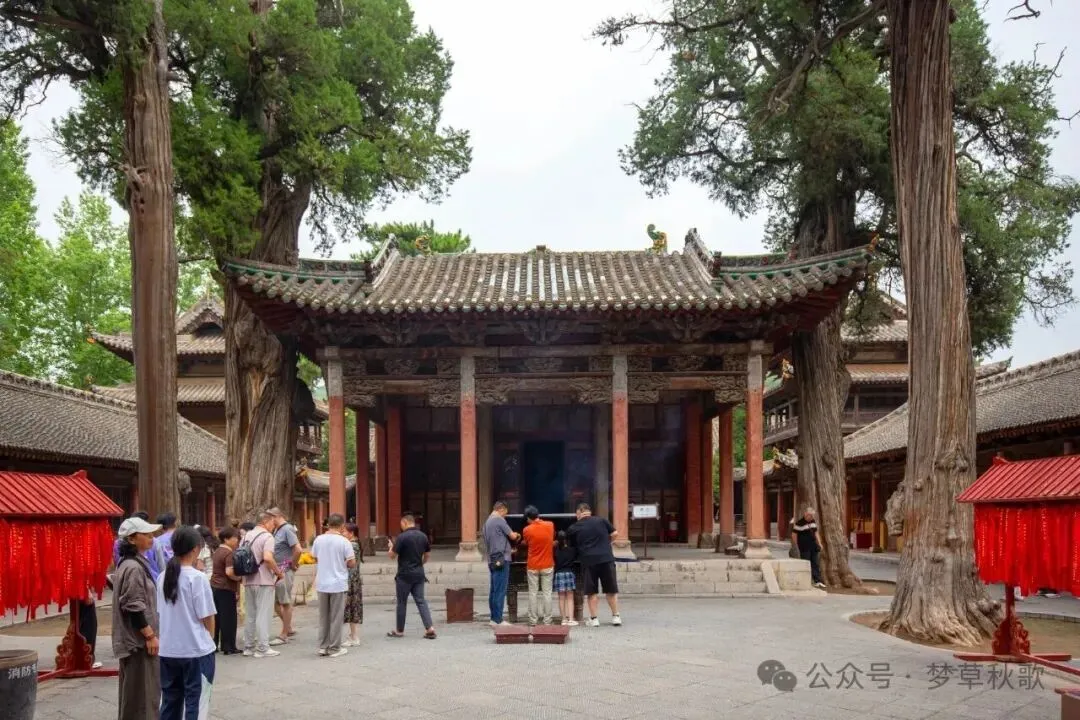 不知不觉间,太阳已经西斜,阳光透过古柏的枝叶洒在红墙上,形成斑驳的光影,庙里的游客也渐渐少了,只剩下潺潺的溪水声和偶尔传来的鸟鸣,显得格外清幽。我坐在献殿的台阶上,看着眼前的古建、古树、古碑,心里满是感慨。这座始建于唐乾宁年间的庙宇,历经千年风雨,见证了金、元、明、清各个朝代的更迭,躲过了战乱兵燹,保存下这么多珍贵的建筑和文物,实在是太难得了。它不像那些热门景点那样人潮涌动,却有着自己独特的韵味,既有金代建筑的古朴厚重,又有山水环绕的灵秀清幽,还有深厚的孝道文化和动人的民间传说。