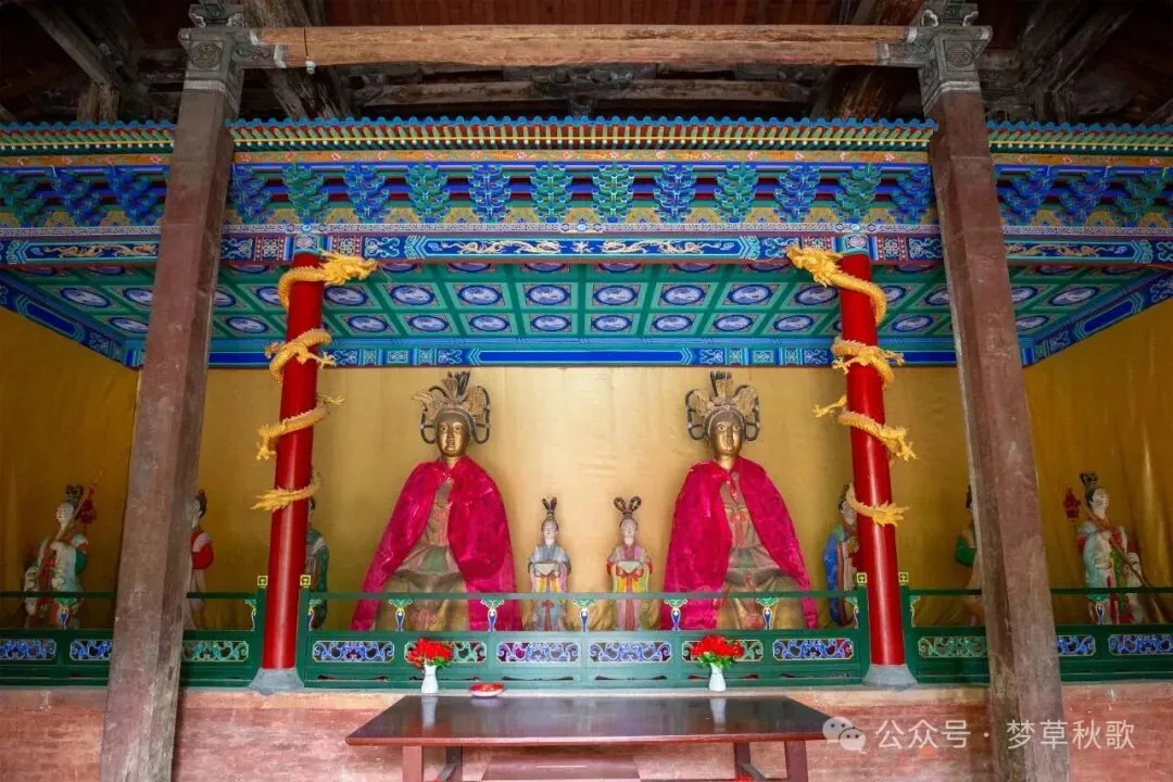 中殿和后殿之间的东西两侧,就是二仙庙的“明星建筑”——东西梳妆楼。这两座楼可是货真价实的金代遗构,距今已经有近九百年历史了,被专家称为中国古代楼阁式建筑的代表作。两座楼形制差不多,都是两层三重檐歇山顶,上层支出平座,下面由斗拱支撑着,看起来既古朴又灵动,像两只展翅欲飞的凤凰。我绕着东梳妆楼走了一圈,仔细看那些斗拱,都是金代特有的琴面式真昂,结构精巧得很,连转角的斜栱都像仙女的发簪一样别致。楼里的彩绘天花也很有看头,牡丹簇拥着藻井,里面还藏着八仙驾云的小彩蛋,抬头一看,仿佛闯进了神仙的宫殿。西梳妆楼虽然经过民国年间的重修,但基本保留了金代的形制,站在两座楼中间往两边看,它们就像两位梳妆打扮的仙女,相对而望,守护着这座千年古刹。