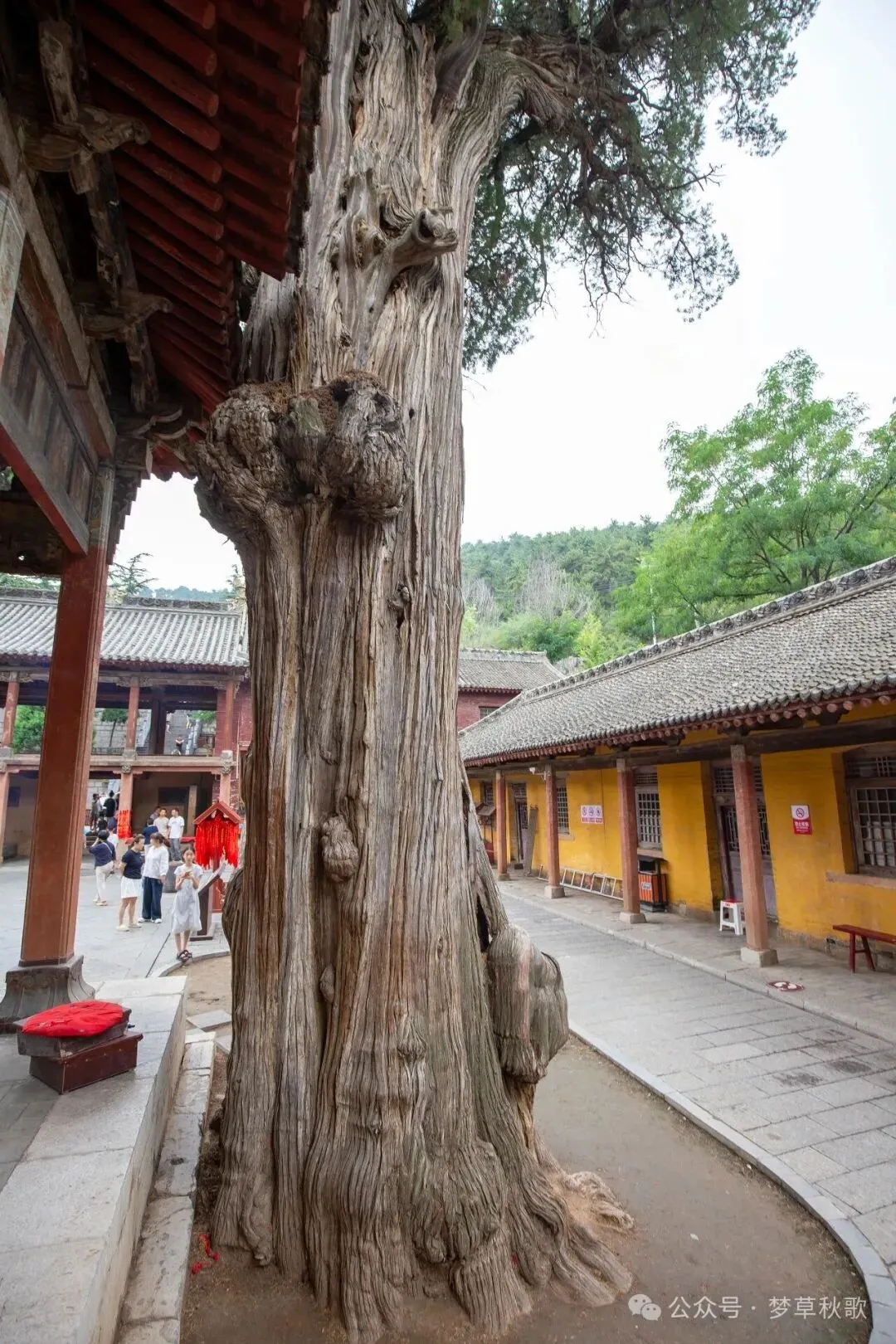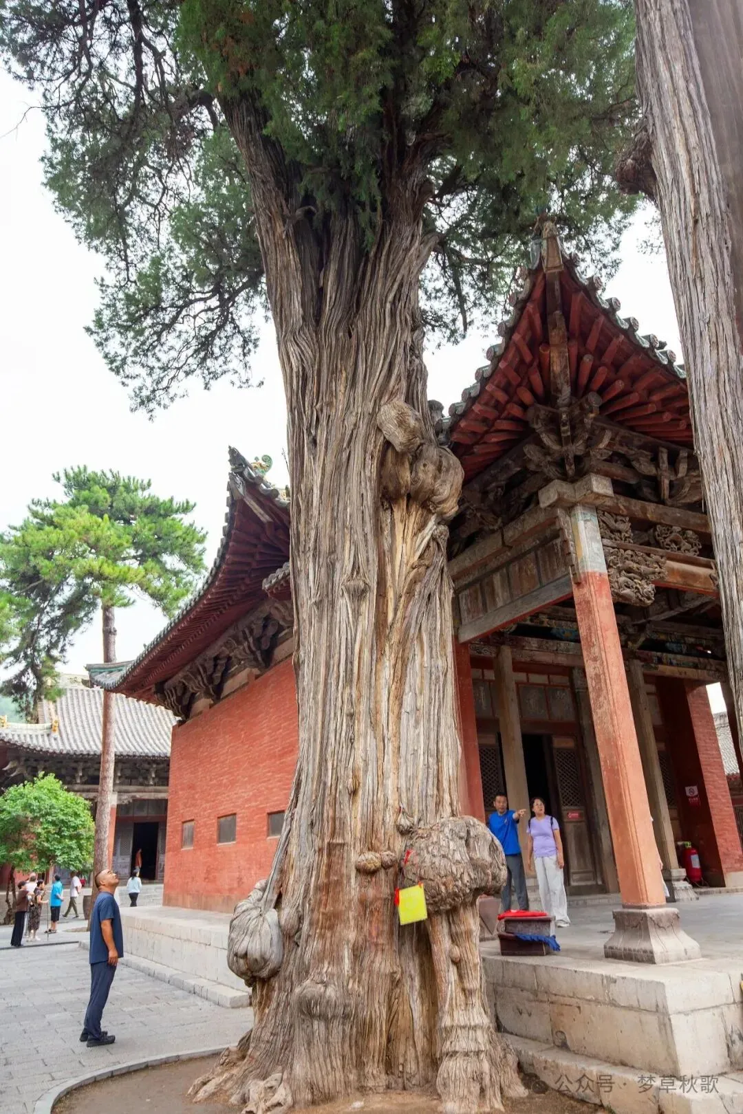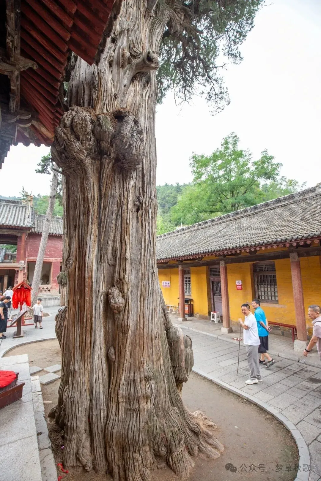 穿过山门,院子里的四棵古柏一下子吸引了我的目光。这几棵树看着就有些年头了,树干遒劲粗壮,枝桠歪歪扭扭地伸向天空,最神奇的是树干上布满了形态各异的树瘤。旁边的指示牌写着“十二生肖柏”,说从不同角度能看出十二生肖的模样。我凑上去左看右看,还真发现了不少惊喜:这个树瘤鼓鼓囊囊的,像极了趴着的小猪;换个角度看另一个,弯曲的纹路活脱脱是条游动的小蛇;还有个尖尖的树瘤,配上旁边的小凸起,分明就是只竖着耳朵的兔子。同行的小朋友兴奋地围着树转圈,一个个地找自己的属相,嘴里还念叨着“摸到老柏树,活个大岁数”的方言口诀,听说这是当地流传了几百年的习俗。树瘤的凹槽里塞满了祈福的红绸,风吹过的时候轻轻晃动,给这千年古树添了几分烟火气。