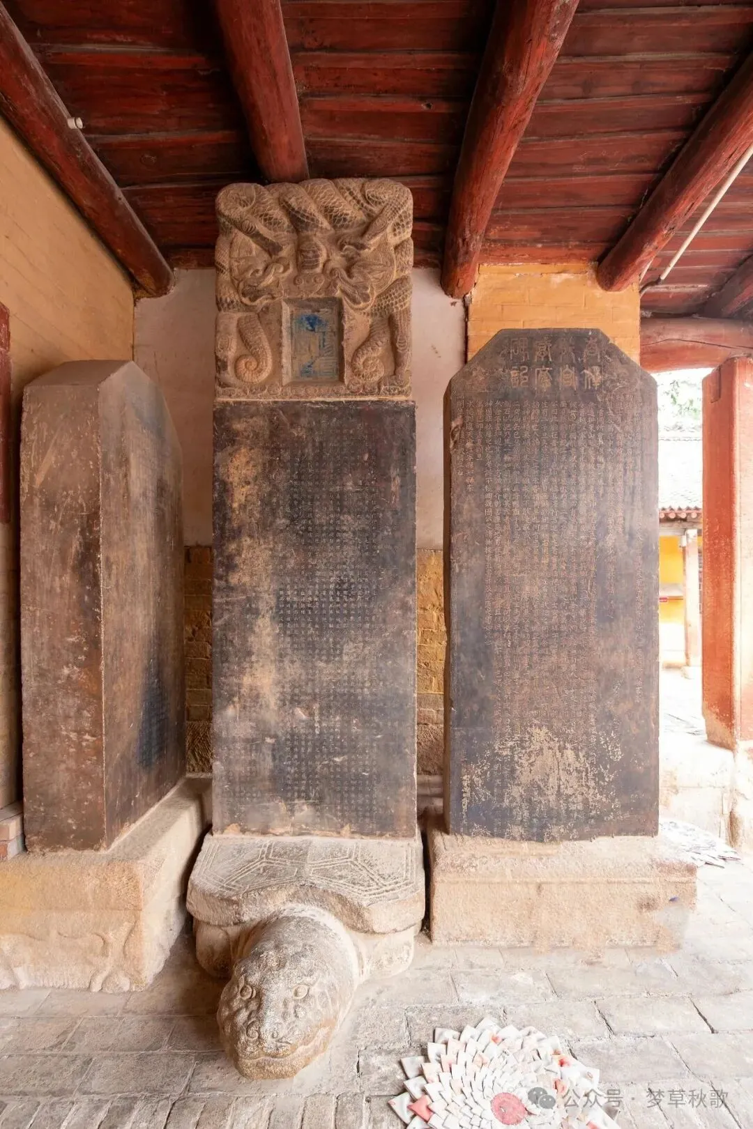 庙子里还藏着不少“文字珍宝”,历代碑刻有29通之多,简直就是一部无声的史书。其中最有名的是两块“状元碑”,一块是金大定五年勒石的《重修真泽二仙庙碑》,由金代陵川籍状元赵安时撰写;另一块是《重修真泽庙记碑》,作者是另一位金代状元李俊民。这两块碑不仅记录了二仙庙的历史沿革,还详细讲述了二仙的故事,对研究二仙信仰特别有价值。中殿后墙上还嵌着元好问的诗碑,勒石于元延祐四年,上面刻着他15岁时写的《西溪二仙庙留题》:“期岁之间一再来,青山无恙画屏开。出门依旧黄尘道,啼杀金衣唤不回。”字里行间满是少年人对西溪美景的喜爱,也难怪他会一年之内来两次。
