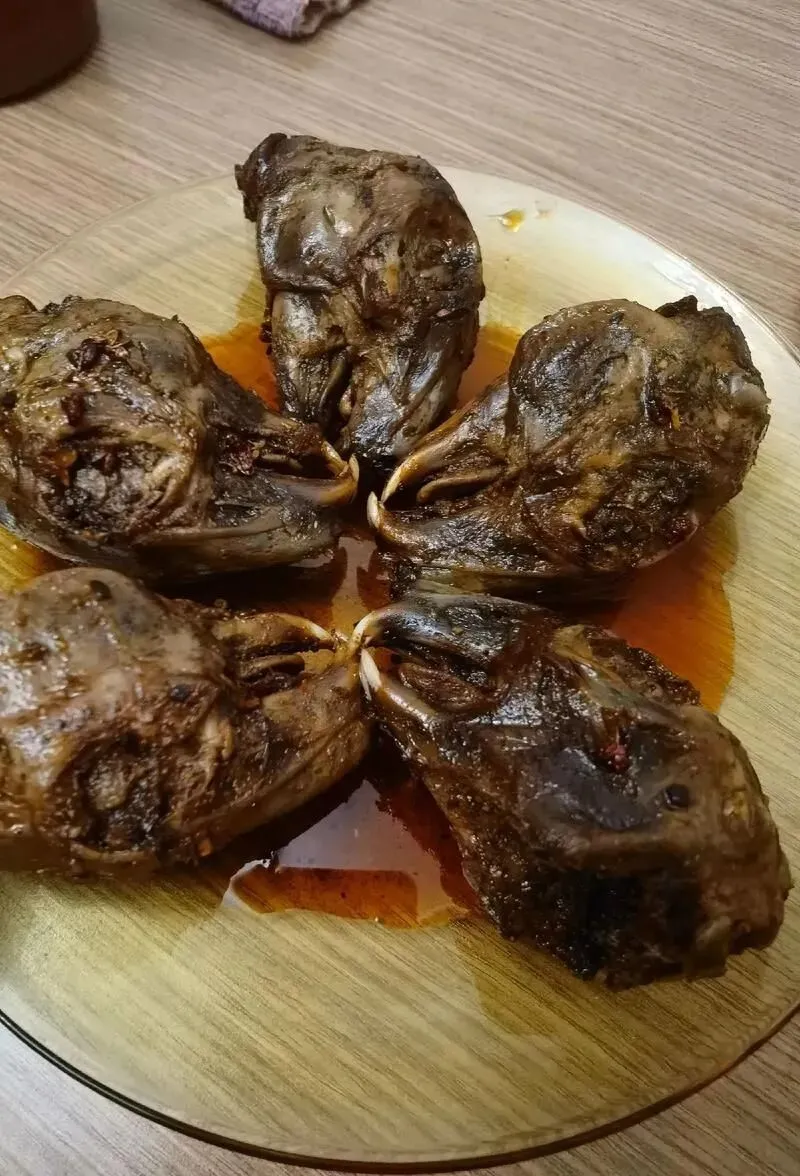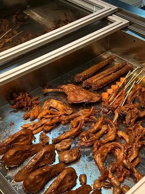 再说兔头。本地做法分红烧和麻辣,新手点红烧,老饕要麻辣。兔脸上那两砣腮帮子肉,嫩的一抿就下来。脑花藏在后头,得把下巴掰开才能掏着,滑溜溜往嘴里一吸,顶香。一个兔头10块出头,配瓶啤酒能磨叽半小时。有日本游客吃完3个,竖大拇指,嘴油的反光。
