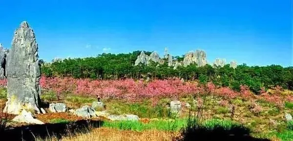 石林与峰丛桃园景区:在园区内的桃园景区,主要以秀丽多姿的岩溶峰丛、绝壁如画的峡谷山崖、娟秀妩媚的幽谷飞瀑碧潭、原始洪荒的石林等景观资源为主体,奇峰林立,绵延逶迤,烟霞萦回,清丽出尘,艳如瑶池,美胜仙境。
