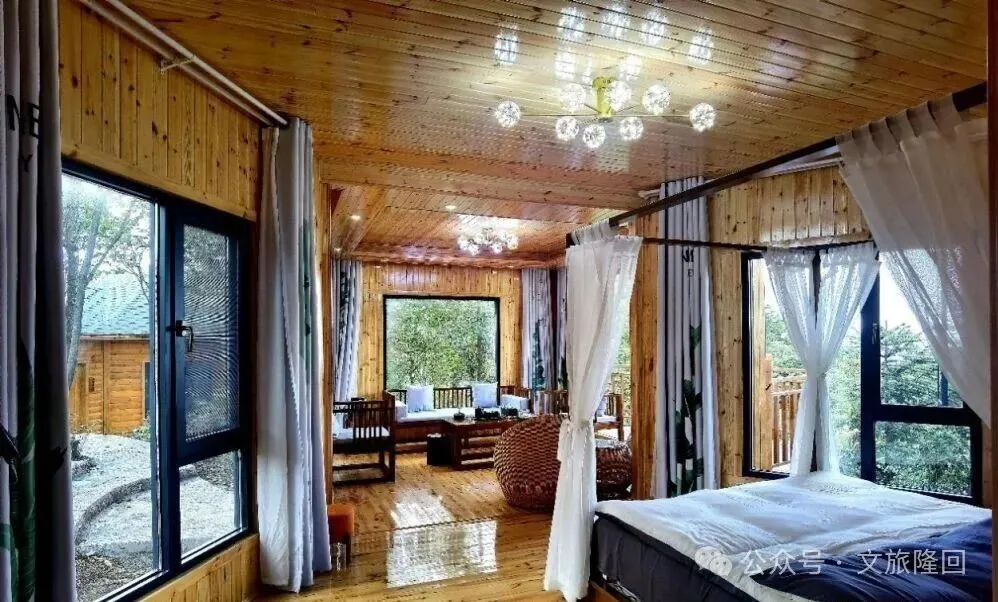 龙瑶幽梦谷聚焦高品质民宿集群建设,深度融合区域山水肌理与乡村特色。其坐拥3800亩原始森林秘境,民宿依山而建且每间配备独立观景阳台,17栋复古与轻奢风融合的独立小木屋房型、布置风格各异;整合森林资源配套餐饮、亲子、露营等多元业态,打造“观景+品茗+阅读”文化休憩空间,推出森林徒步、观星、康养等体验项目,构建“民宿+生态+文化+休闲”一体化度假场景,凭借海拔优势形成的夏季平均21度气候已成为避暑康养度假绝佳之地,为游客提供兼具舒适度与体验感的乡村度假选择,有效带动周边乡村旅游消费与村民增收。