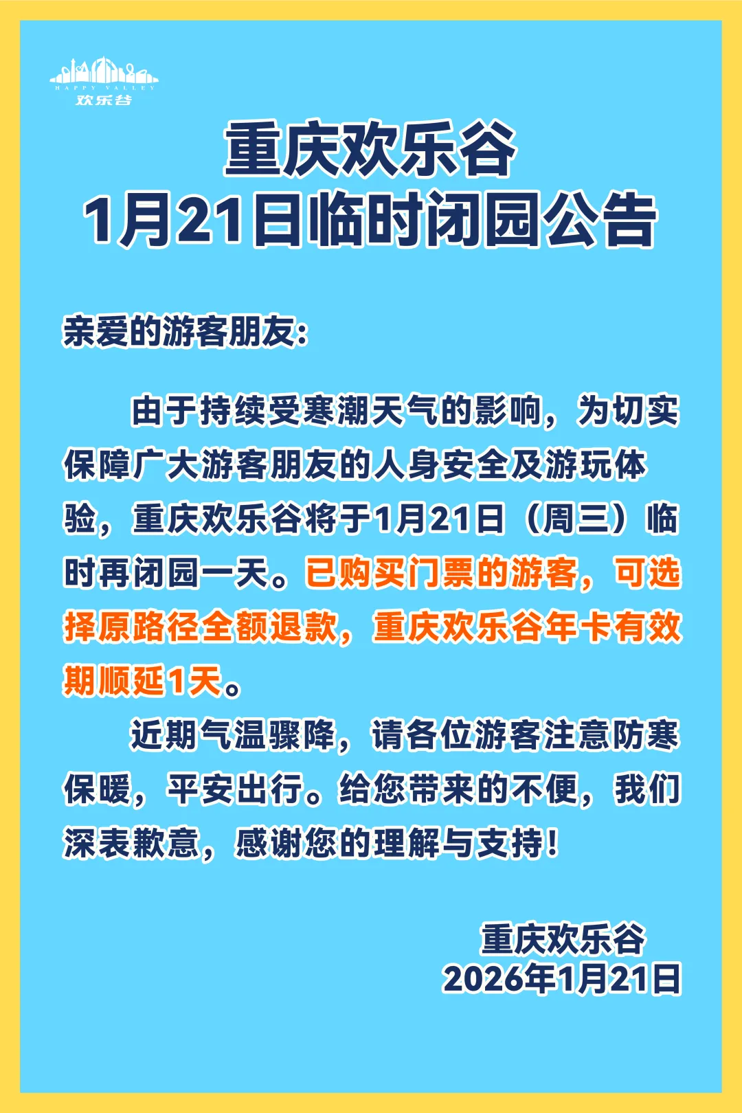 您现在的位置是:首页 > 国内旅游目的推荐 > 正文 国内旅游目的推荐 莫跑空!因天气原因,重庆3个知名景区临时闭园 admin2026年01月21日 13:28:55国内旅游目的推荐1 莫跑空!因天气原因,重庆3个知名景区临时闭园@所有计划近期打卡重庆的朋友们!因天气原因巫峡·神女景区及三峡龙脊重庆欢乐谷临时闭园不要跑空哦~👇巫山受冰雪天气影响为切实保障游客出行安全巫峡·神女景区、三峡龙脊自2026年1月20日起临时闭园开放时间另行通知0主城由于持续受寒潮天气影响重庆欢乐谷1月21日(周三)临时闭园一天小伙伴们注意别跑空 END |来源:巫山发布、重庆欢乐谷、重庆发布等综合|声明:除原创内容特别说明外,推送稿件文字及图片均来源于网络及各大主流媒体。版权归原作者所有,如认为内容侵权,请联系我们删除。推 荐 阅 读 转载请说明来源于"旅荐网",部分内容转载自网络,如有侵权请联系qlwl@foxmail.com删除 本文地址:https://www.15386.cn/post/84579.html 上一篇 淮南寿县景点 下一篇 带着莫弈去旅游~ 相关文章 岳父全家来旅游7天花50000,回去时让我买机票,我给妻子也买了一张,第二天,全家都骂我. 四川这5个景区绝了,简直美爆了! 乐山景点人气榜!第一次来照着玩秒变老司机 【政策动态】吉尔吉斯斯坦旅游应用Travel Tunduk开发计划尚待确认 麻城景区闭园公告:受雨雪天气影响,即日起多景点暂停对外开放,安全第一! 带着莫弈去旅游~ 淮南寿县景点 旅游签不行!免面试是误区!去法国参加“国立高等”的试镜都会这么难?! #黄果树瀑布壮观景象 #贵州旅游必去景点 # 宣纸小镇景区关于1月22日至24日临时闭园的公告 发表评论 取消回复 评论列表 这篇文章还没有收到评论,赶紧来抢沙发吧~
