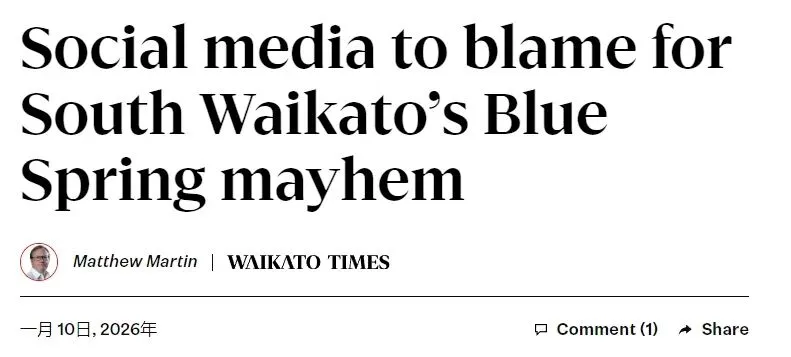 2026年1月10日,Waikato Times发布一篇报道,指出蓝泉之所以大火,主要“责任”在于社交媒体。