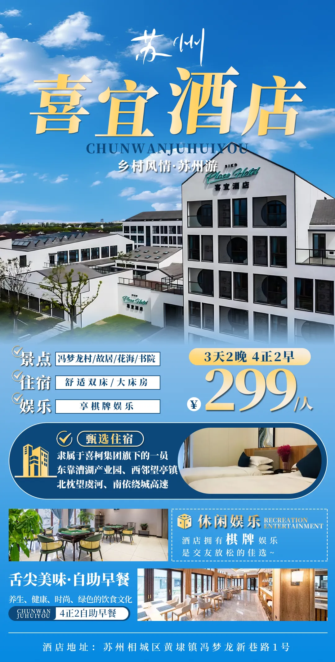 苏州·景区内【喜宜酒店】299元每人,3天2晚含6餐,赠冯梦龙景区游览!4人赠棋牌畅打!环村游览 水美田园乡村风光!