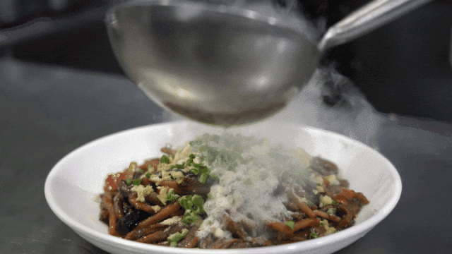 上桌时盘中油还在辟叭作响,香气扑鼻