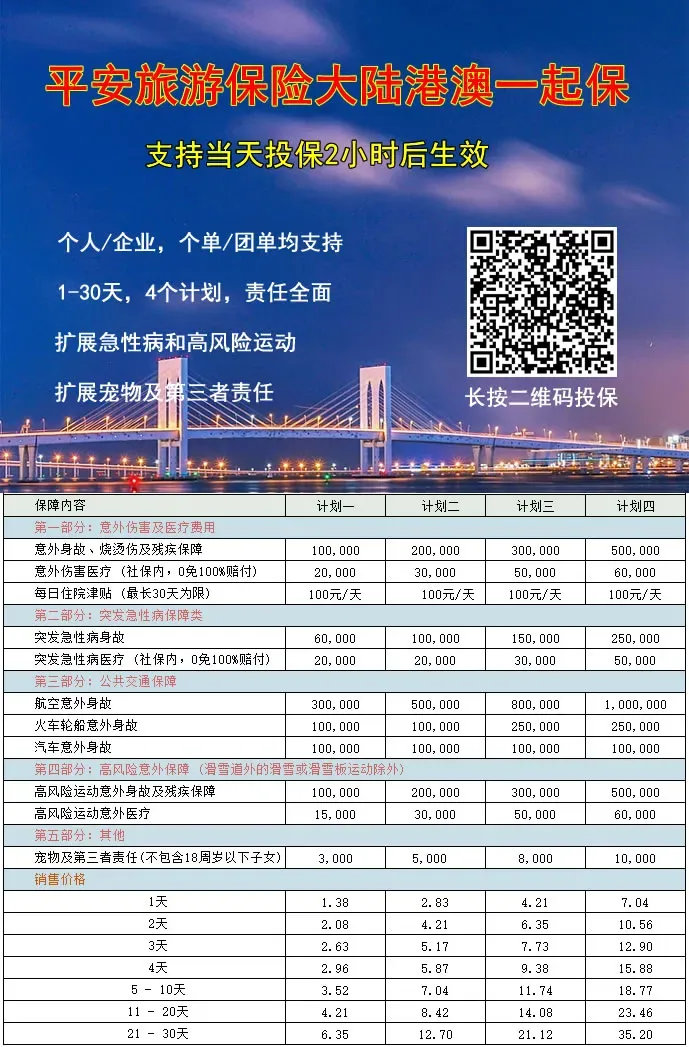 平安旅游保险大陆港澳一起保:支持当天投保2小时后生效,1-30天,支持团单,扩展急性病/高风险运动身故及医疗,宠物及第三者责任