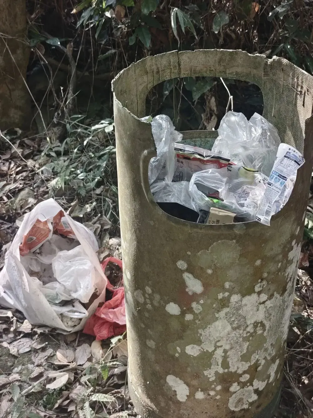 ▲登山道旁的垃圾桶及散落在外的垃圾