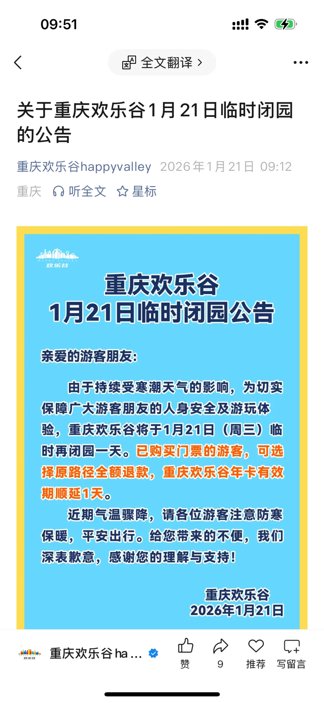 由于持续受寒潮天气的影响,为切实保障广大游客朋友的人身安全及游玩体验,重庆欢乐谷将于1月21日(周三)临时再闭园一天。已购买门票的游客,可选择原路径全额退款,重庆欢乐谷年卡有效期顺延1天。