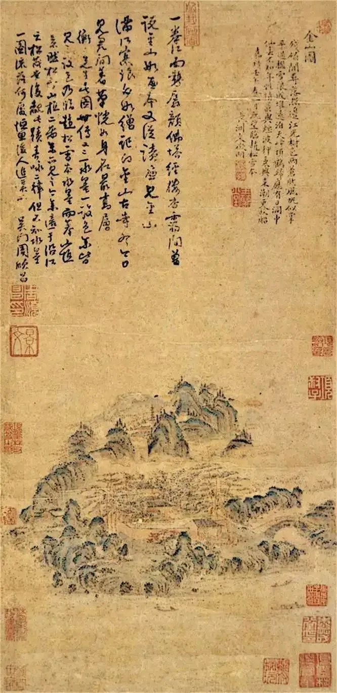 古代金山原是屹立于长江中流的一个岛屿,由于“大江东流”,清光绪末年(1903年)左右与陆地连成一片