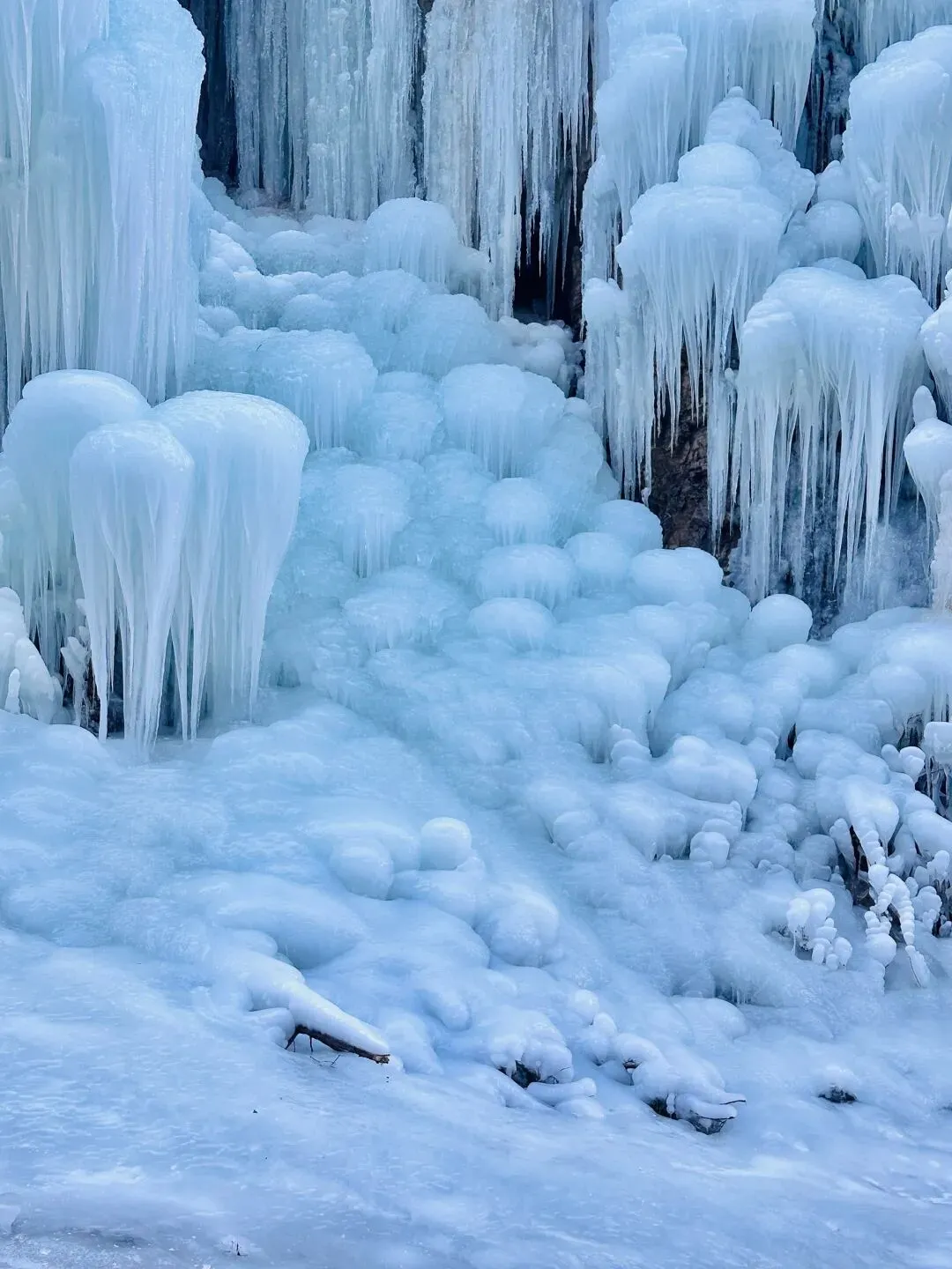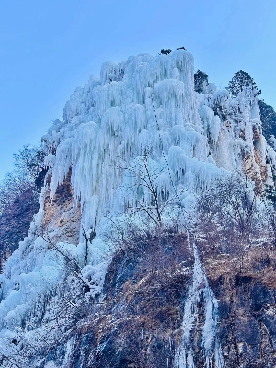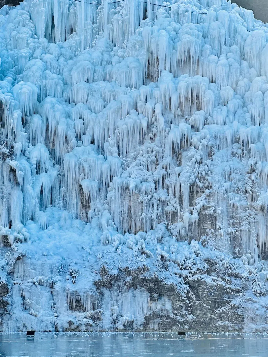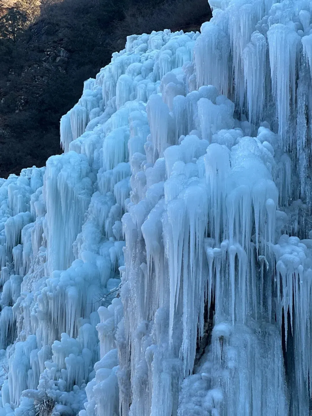 循步道徐行,未几,豁然开朗。遥见对面百尺崖壁之上,冰瀑垂天而下,宛若银河凝冻,玉龙僵卧。其势磅礴,沿山脊蔓延数十米,冰柱、冰凌、冰壁层层复垂,叠雪堆琼。日光映照之下,通体晶莹璀璨,寒芒流转,似万千水晶攒聚而成。