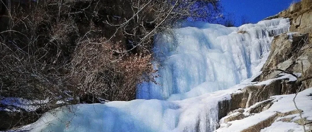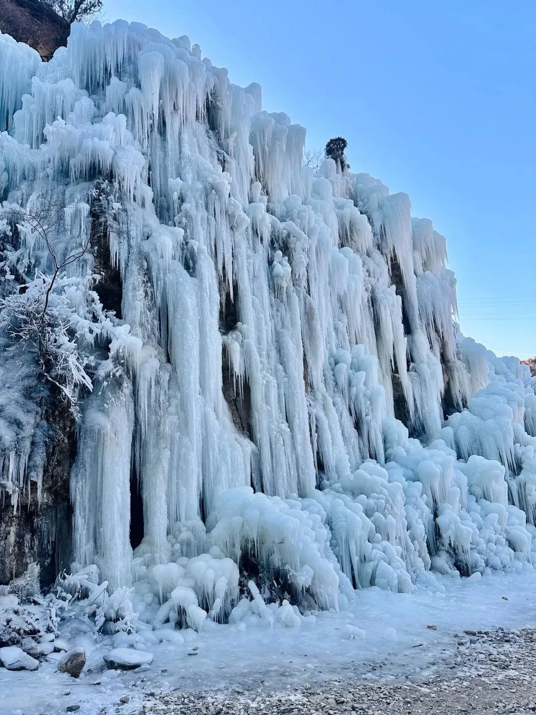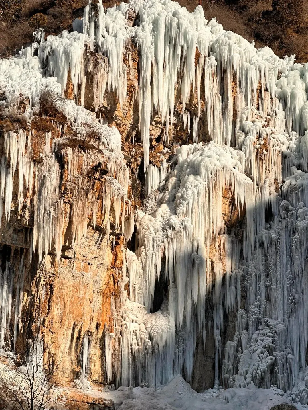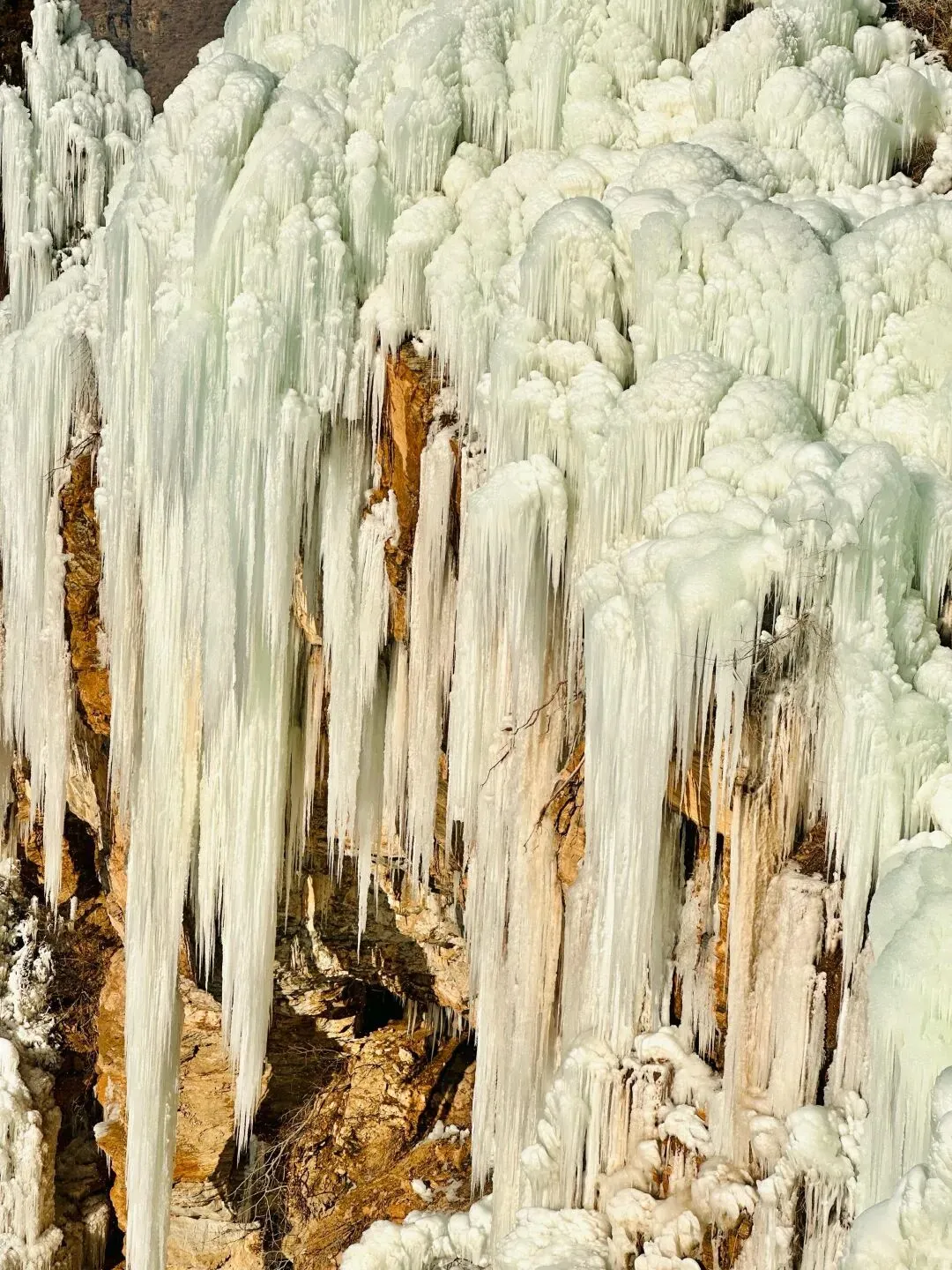 循步道徐行,未几,豁然开朗。遥见对面百尺崖壁之上,冰瀑垂天而下,宛若银河凝冻,玉龙僵卧。其势磅礴,沿山脊蔓延数十米,冰柱、冰凌、冰壁层层复垂,叠雪堆琼。日光映照之下,通体晶莹璀璨,寒芒流转,似万千水晶攒聚而成。