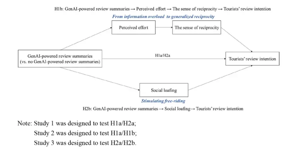 H1a:GenAI 评论摘要提升游客评论意愿 H1b: 游客感知到的信息处理努力及其互惠感依次中介了基于生成式人工智能的评论摘要对游客评论意向的影响。 感知努力 ↓ → 互惠感 ↑ → 评论意愿 ↑(依次中介)
