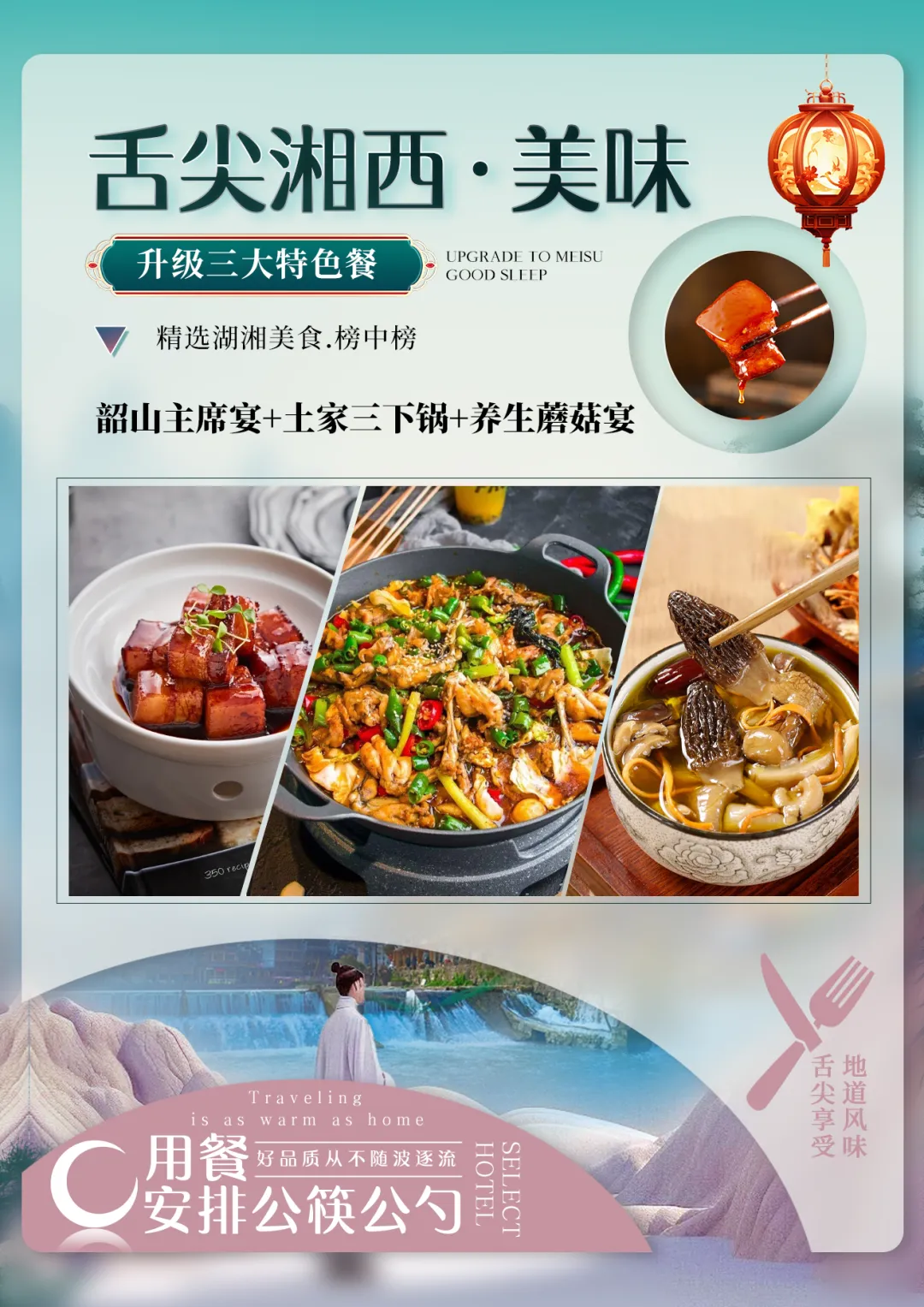 夜间赠送大型原创行浸式实景民族风俗演绎【花开芙蓉—毕兹卡的狂欢】(因景区赠送晚会,如遇堵车、下雨或官方停演及特殊原因不能正常观看无退费请谅解)呈现形式在中国旅游演艺中独一无二。观演是在独有的自然、人文环境中行进与沉浸相结合,室外与室内相呼应。其间你可见证千年前土王内心的强大和刚烈以及土王与楚王立柱为盟的场景。你可欣赏以祈福为目的的“梯玛神歌”、“土家铜铃舞”、“摆手舞”、“茅古斯舞”、“厄巴舞”等;你可听到迷人的“土家恋歌”、“哭嫁歌”。一条酉水长又长,芙蓉镇里好风光;人生难逢真美事,此刻不妨醉一场。